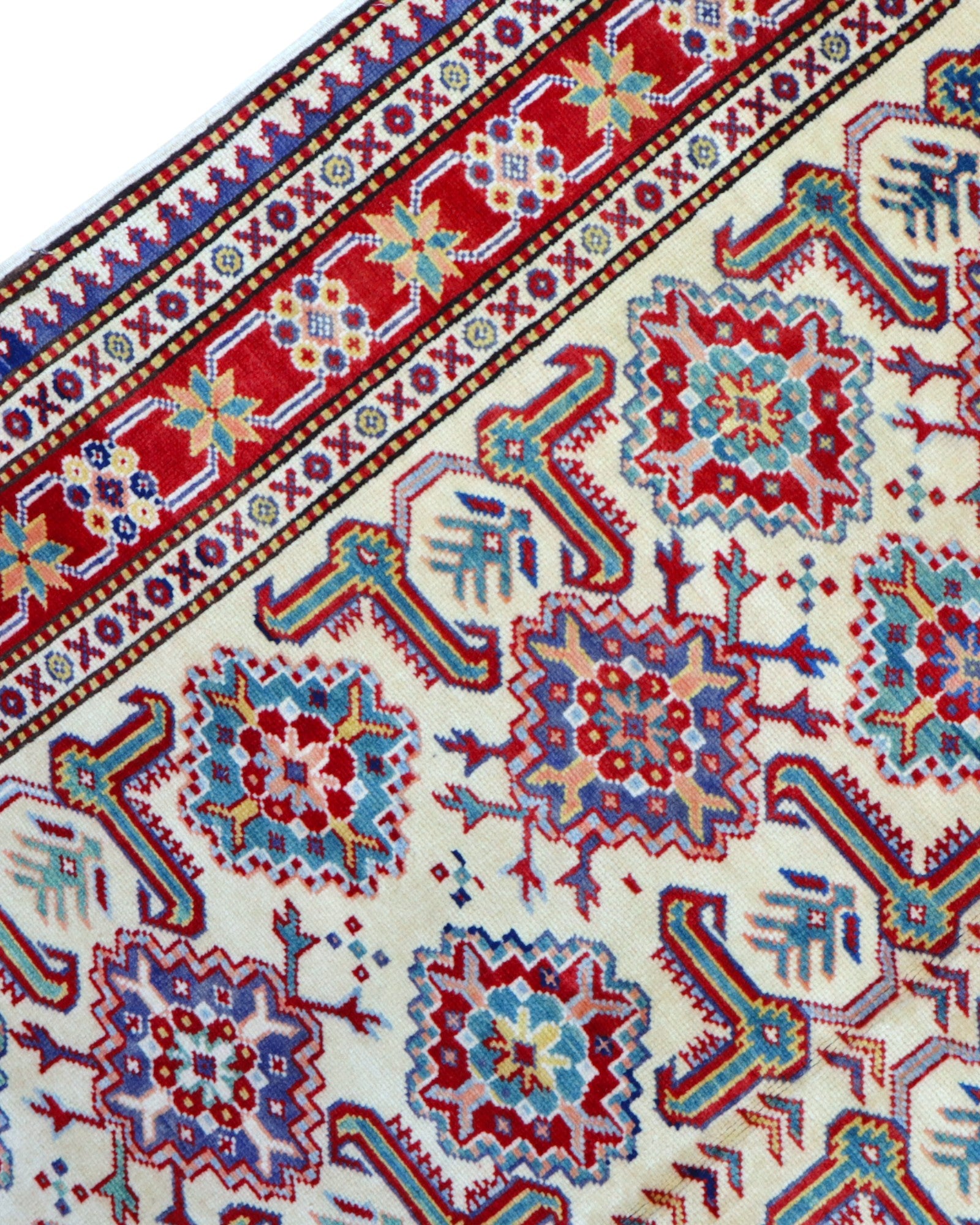 Design: Geometric and floral motifs in shades of red, blue, green and cream on a beige background