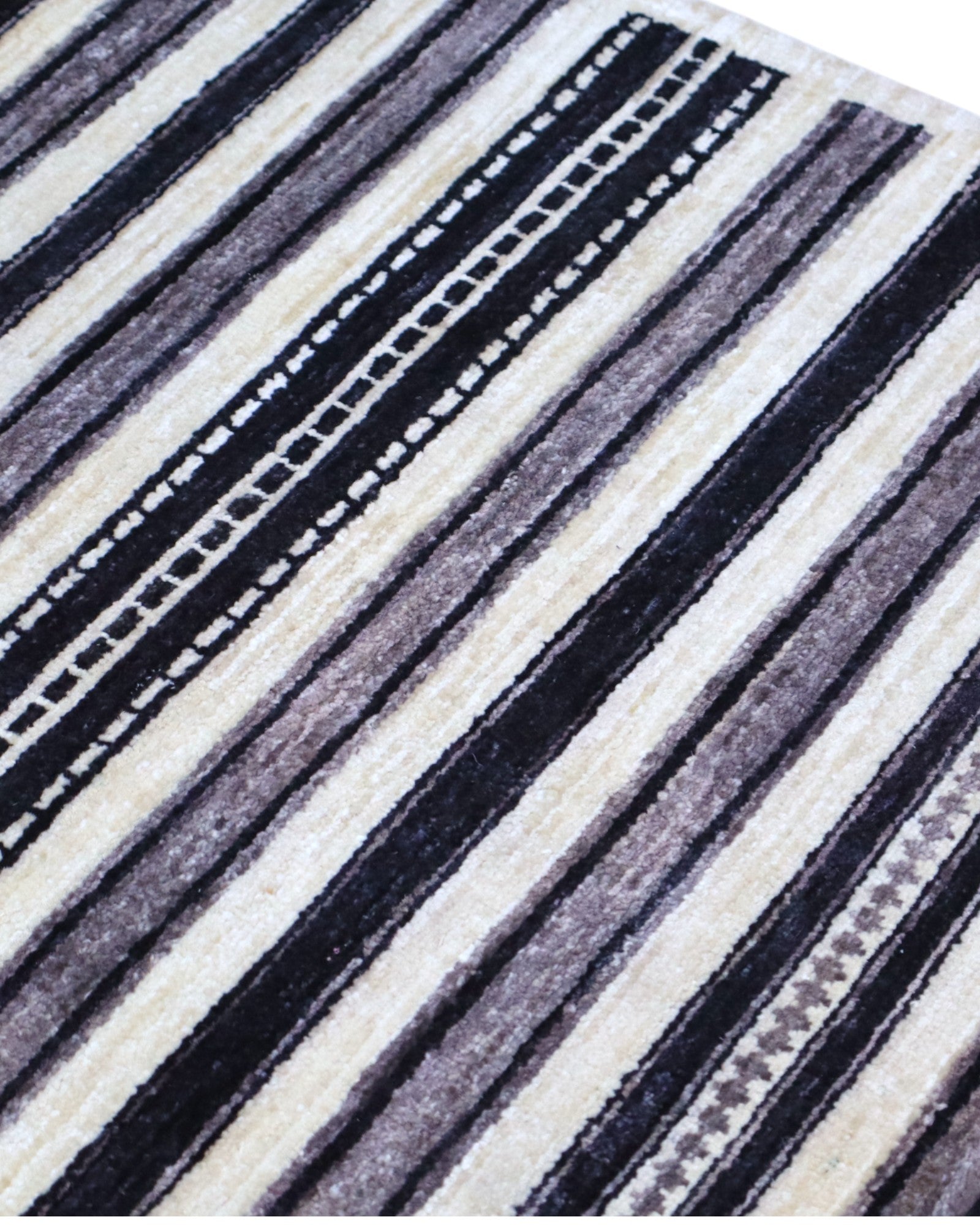 The design features a beige background , on which alternating horizontal stripes of different widths , in shades of black and gray . Some thinner stripes feature a dotted pattern that adds an interesting detail, giving the rug a bold and modern character, inspired by Nordic style .