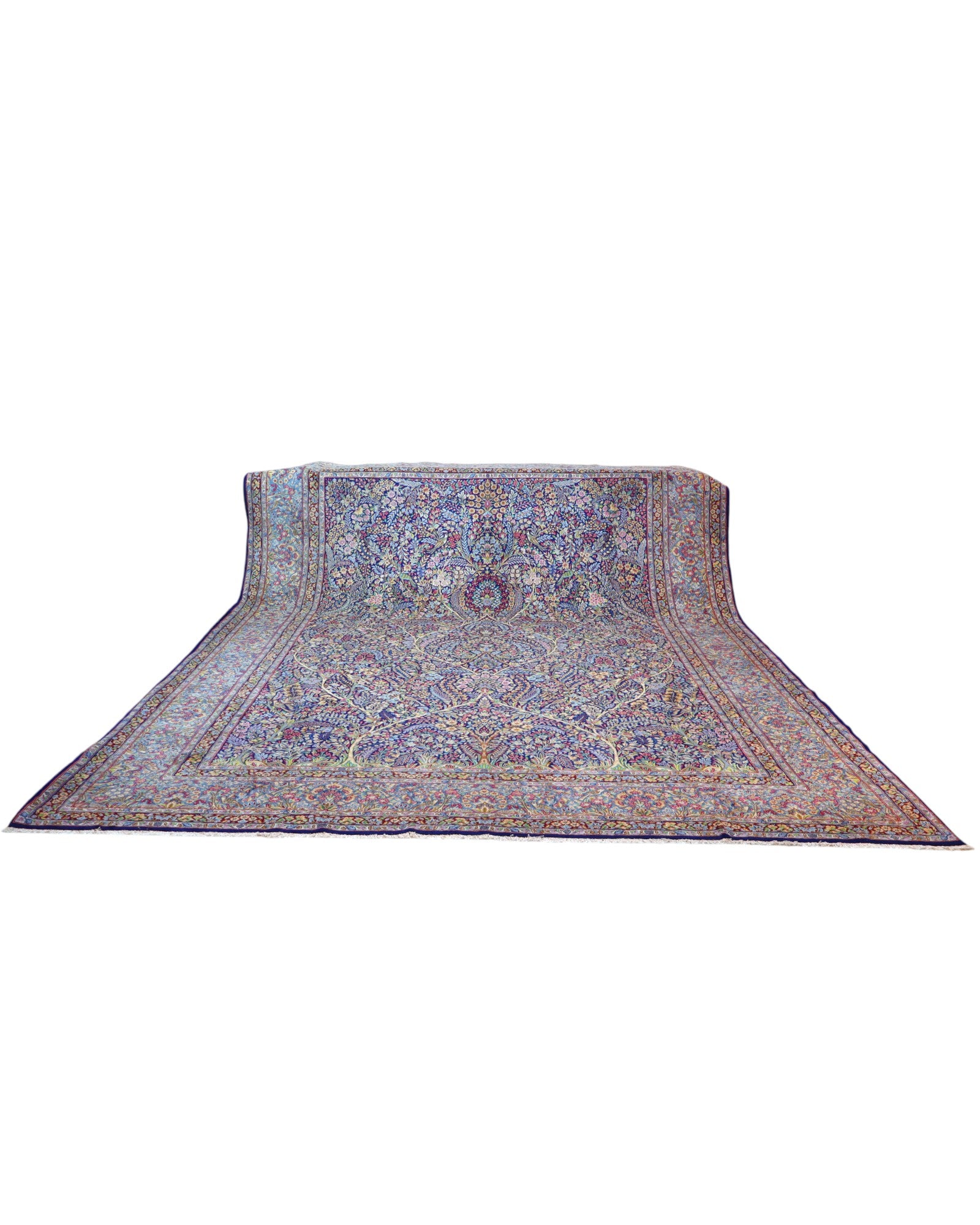 The 486x357 cm Kerman rug is a masterpiece of Persian refinement , featuring a dense, harmonious floral design that extends with precision across the entire surface. The blue and light blue background highlights the interwoven floral motifs, creating a rich and vibrant visual effect.