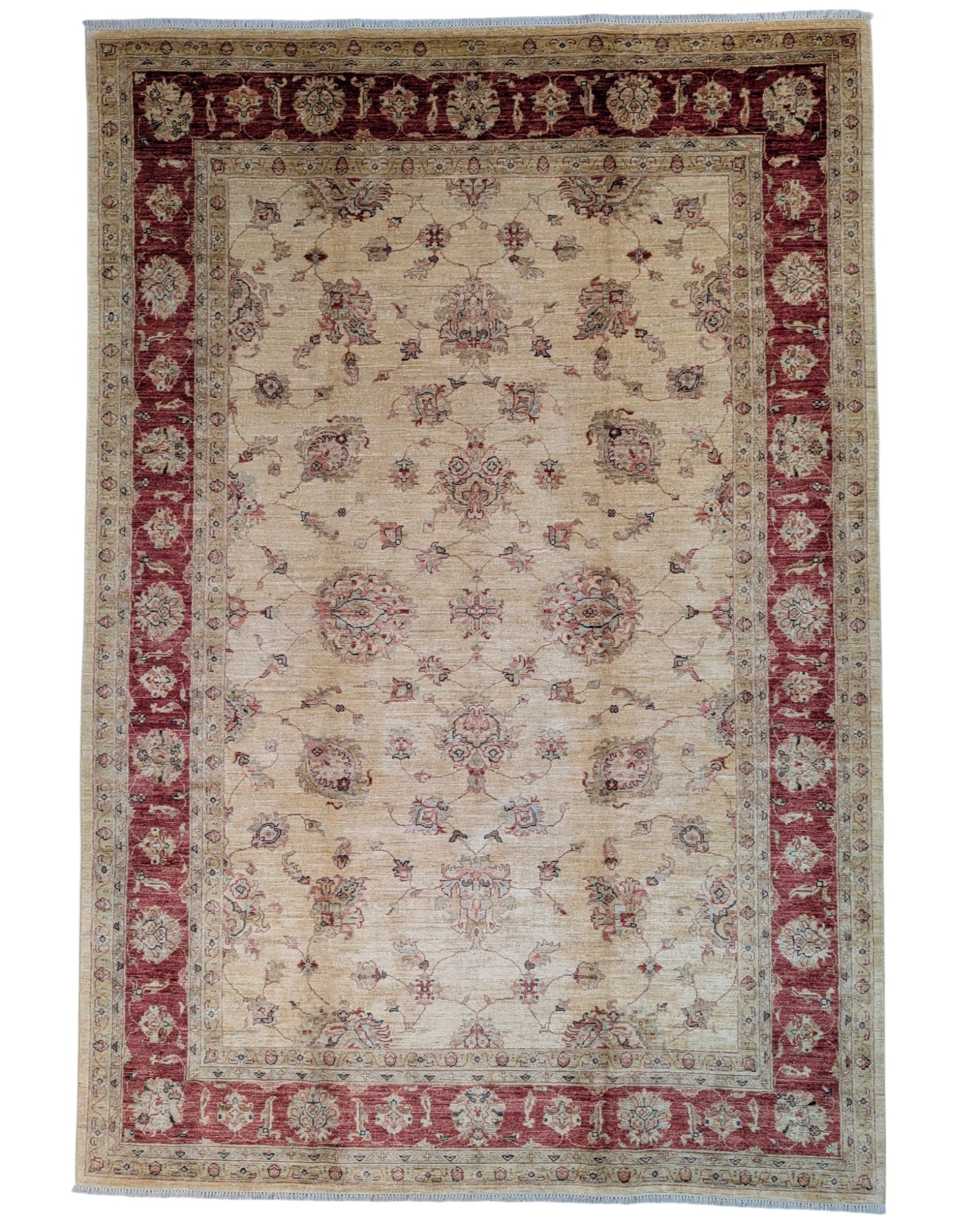 Add a touch of refined luxury to your home with this stunning Farahan rug. Masterfully hand-knotted in Afghanistan, this rug combines contemporary design with the elegance of ancient Persian motifs. The central field features a sophisticated beige background, which serves as a backdrop for a rich, deep red frame. Delicate floral details in vibrant turquoise gracefully unfold across the rug, creating a visually striking color contrast and adding a touch of originality. Crafted from high-quality materials—cotton warp and weft, and hand-knotted wool pile with vegetable dyes—this rug is not only a feast for the eyes, but also a guarantee of durability and softness. Its craftsmanship makes it a true piece of art, capable of bringing warmth, style, and a welcoming atmosphere to your space. Measuring 296 x 203 cm, this elegant Farahan rug is ideal for enhancing living rooms, dining rooms, or studies, becoming a distinctive element of your decor.