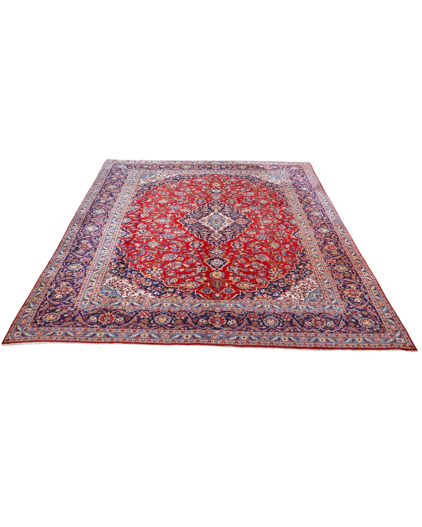 This splendid, large Kashan rug represents one of the finest examples of Persian textile art. The central field, in an intense crimson red, features a finely decorated lozenge medallion in shades of blue and ivory, surrounded by a rich floral design that harmoniously extends across the entire surface.