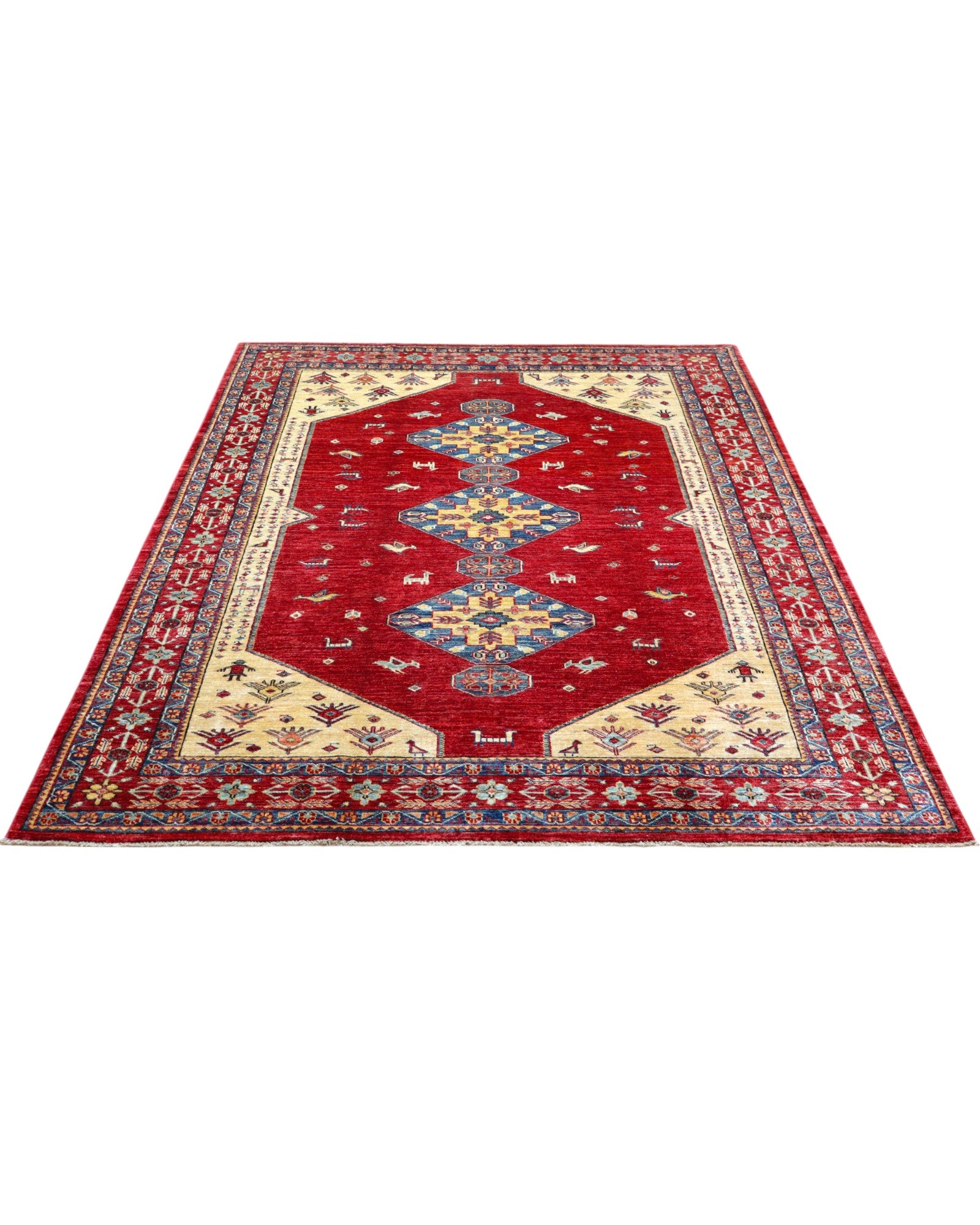 This Kazak rug is a true expression of artistry and craftsmanship. Hand-knotted on a traditional loom by expert craftsmen, with a durable cotton warp and weft and a pure wool pile dyed with vegetable dyes, this 240 x 178 cm creation is a masterpiece of remarkable beauty and exquisite craftsmanship.