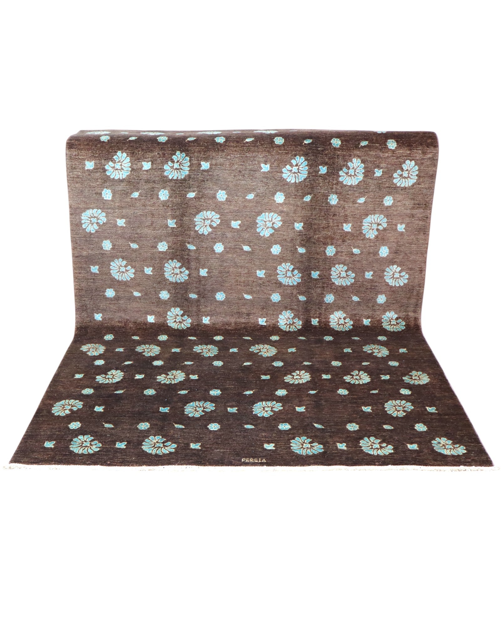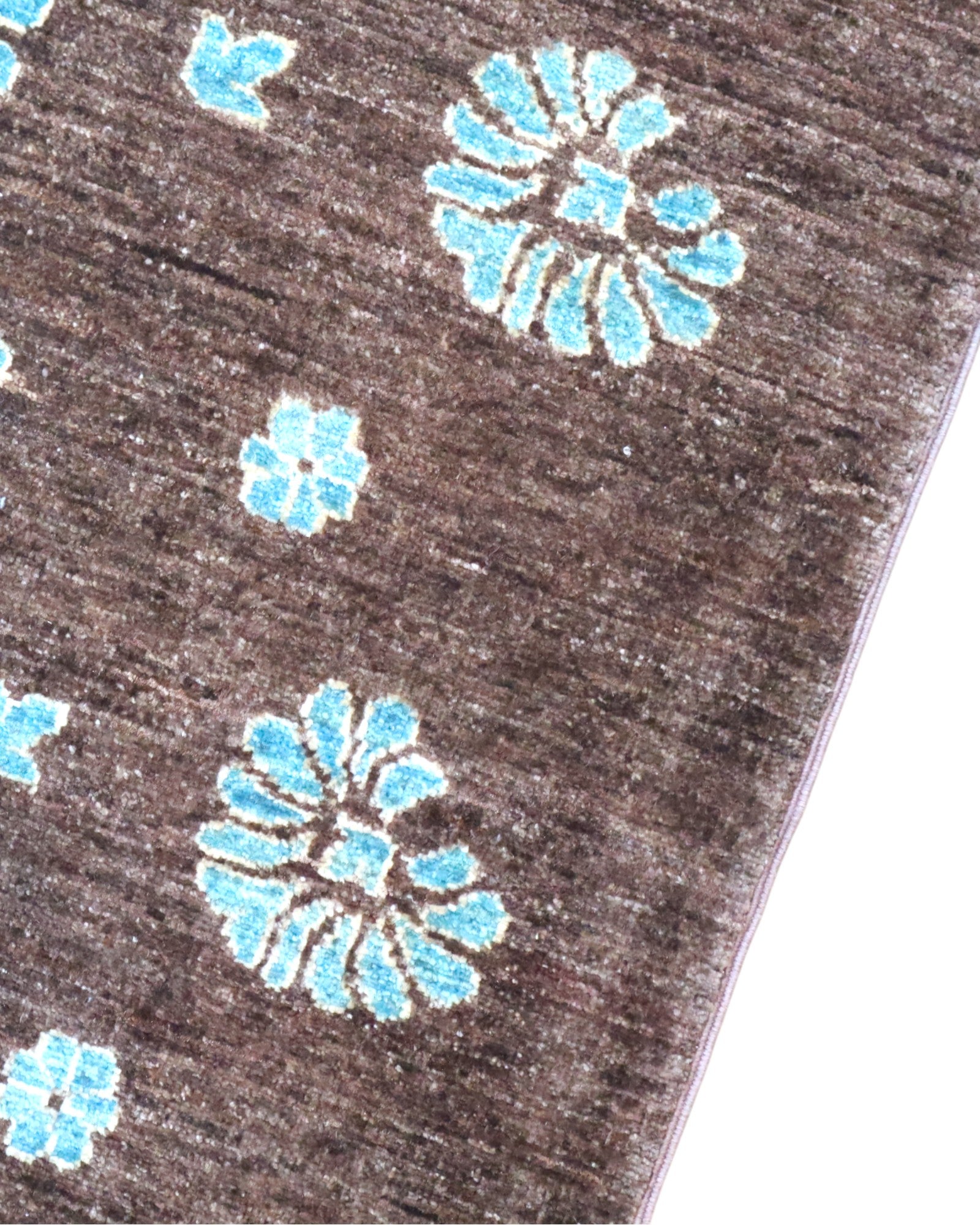 The design features an elegant brown background enriched with small blue floral motifs arranged regularly across the entire surface. The contrast between the dark background and the bright, vibrant details gives the rug a luminous and light feel.