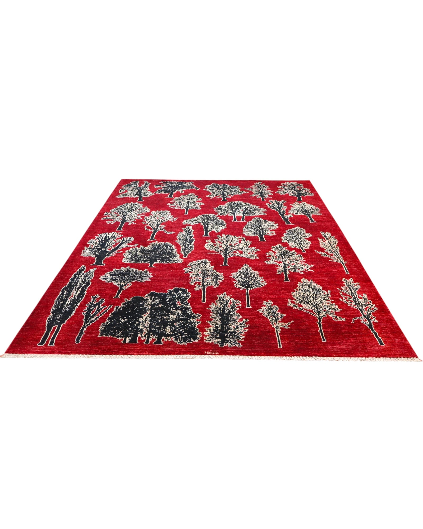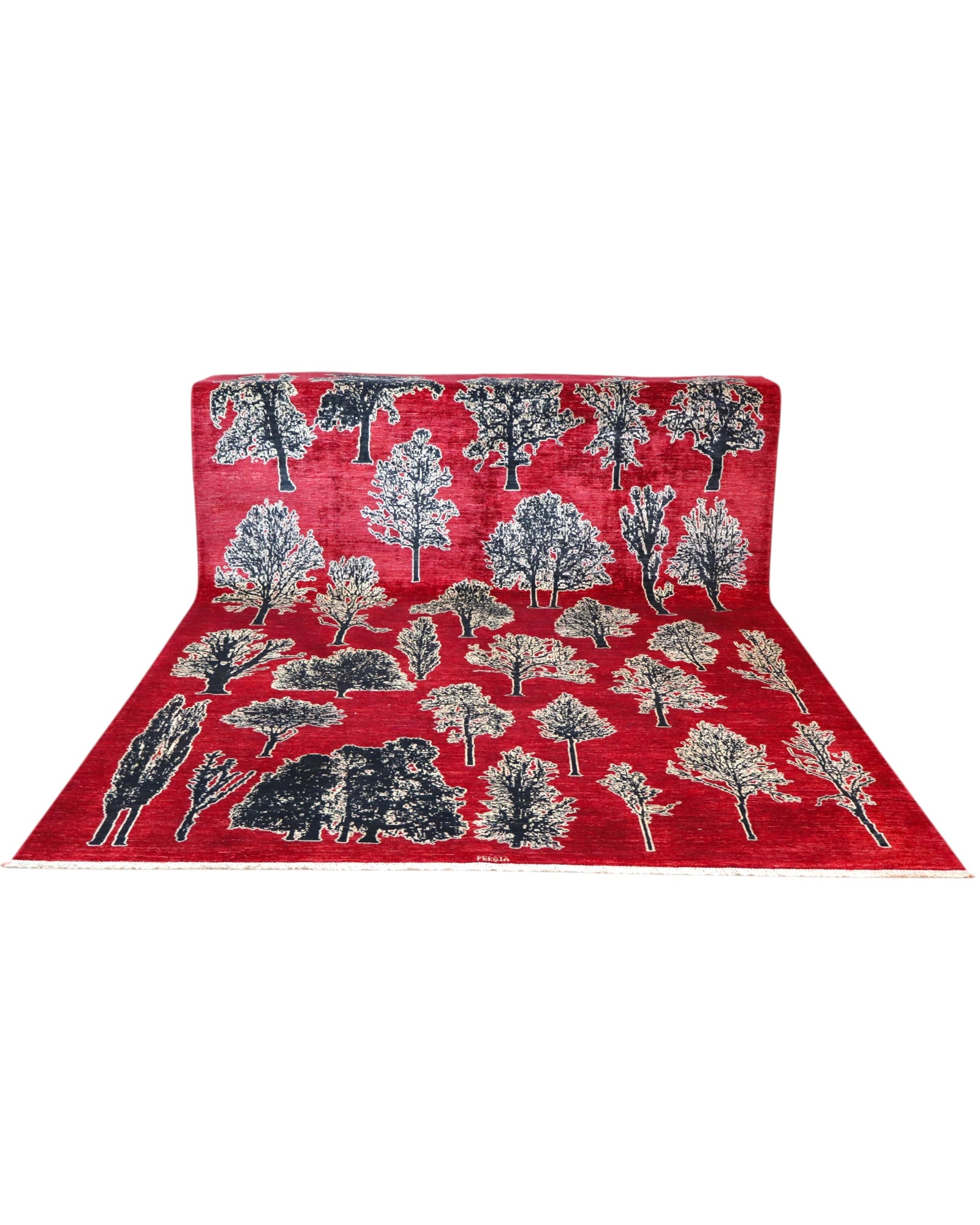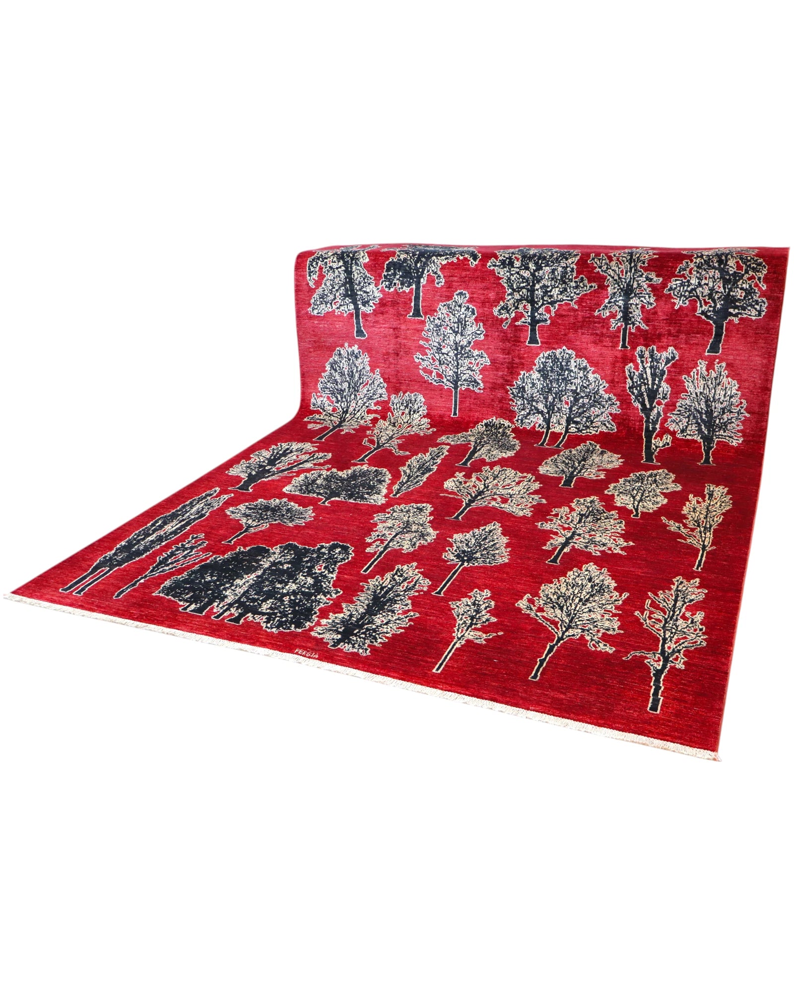 An imposing and visually striking textile work. This modern Persian rug features a unique design, featuring a collection of stylized trees, each unique, elegantly set against a deep ruby red background.