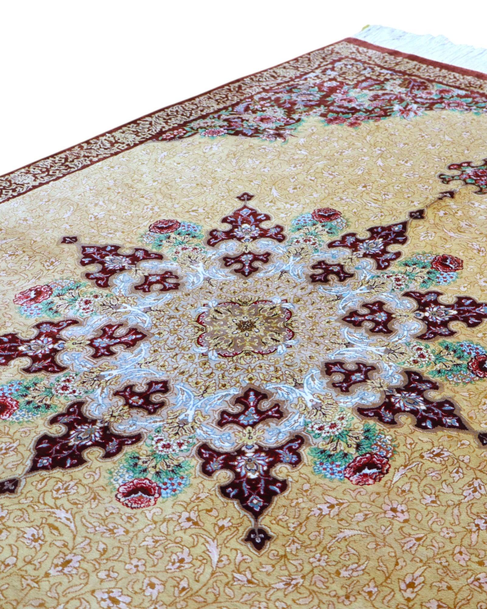 A textile jewel of extraordinary elegance, a symbol of Persian luxury. This Qum rug is made entirely of fine silk, meticulously hand-knotted by Persian artisans, custodians of an ancient and renowned tradition.