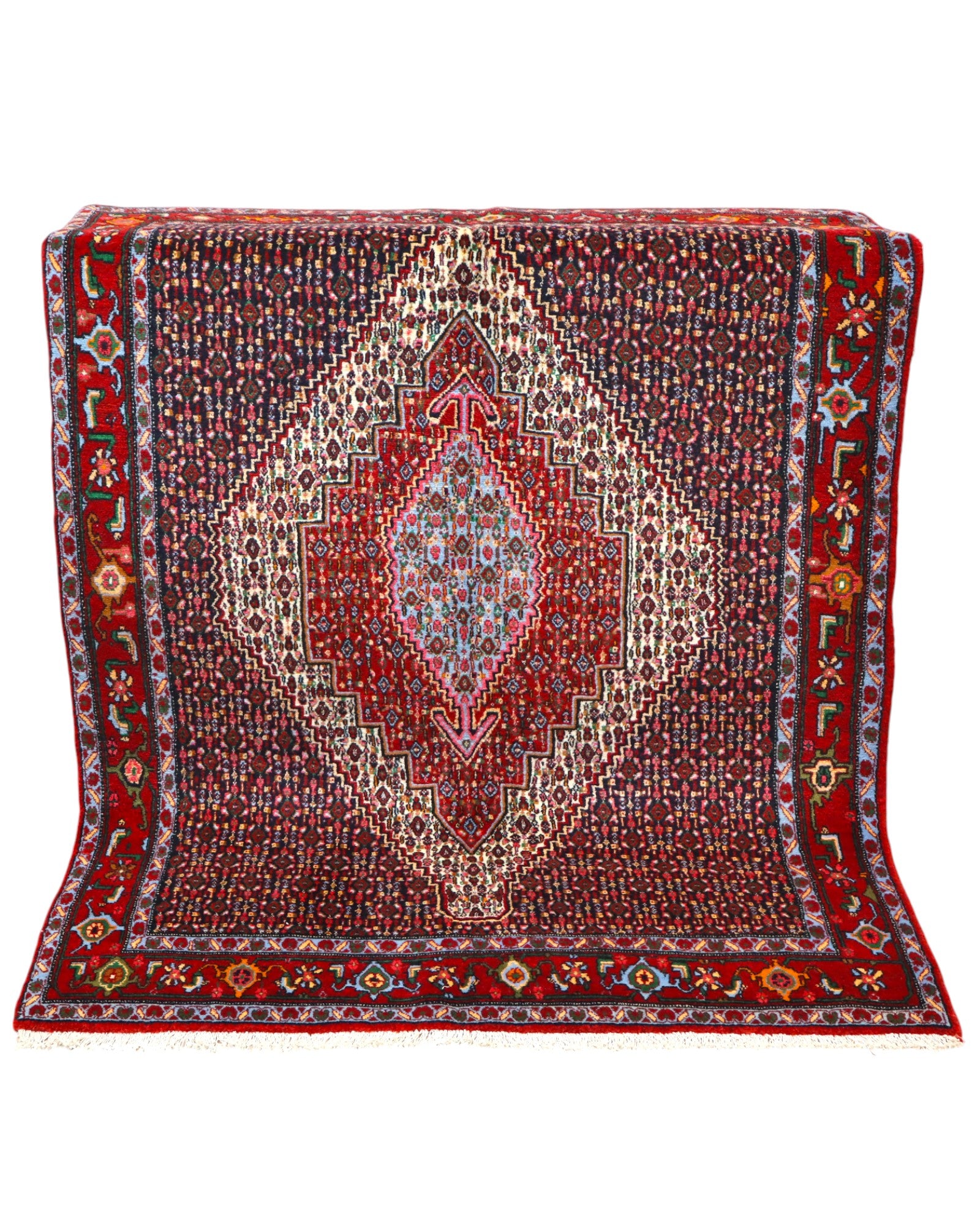 This magnificent Senneh rug , hand-knotted in Persia, represents one of the finest examples of Persian textile art. Crafted with a durable cotton warp and weft and a soft wool pile, dyed with natural vegetable dyes, it offers excellent quality and enduring beauty.
