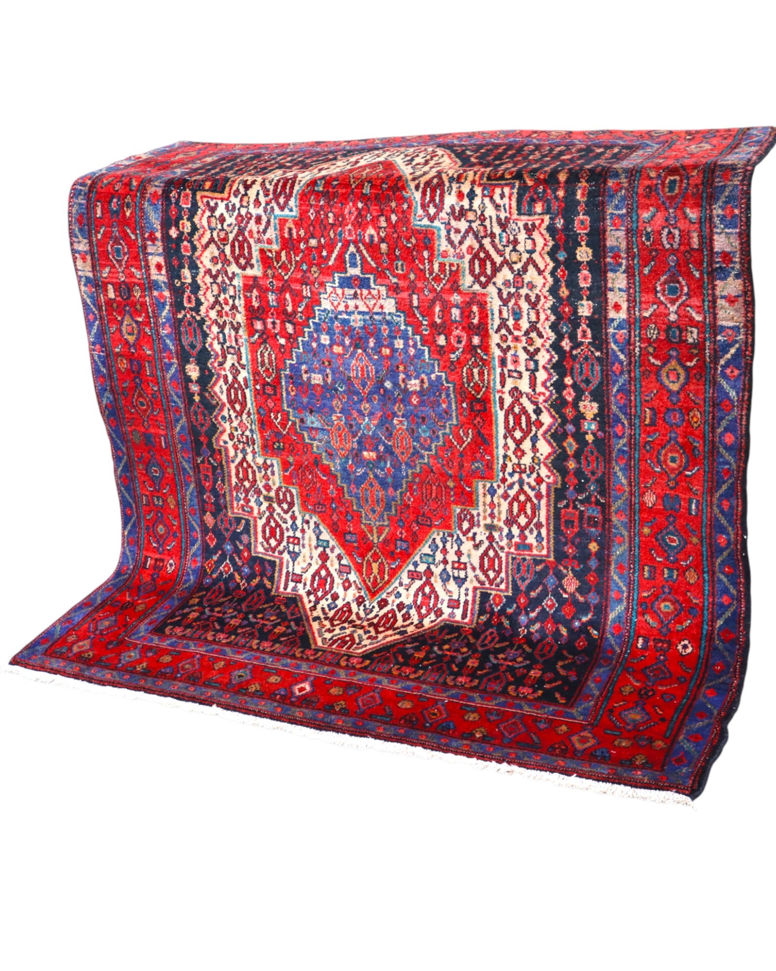 The 176x146 cm Senneh rug is a classic example of Persian Kurdish tradition, renowned for its finesse and compact knotting . This model features a large central diamond medallion on a blue background, surrounded by intense ruby red hues and geometric ladder motifs that lend depth and visual harmony.