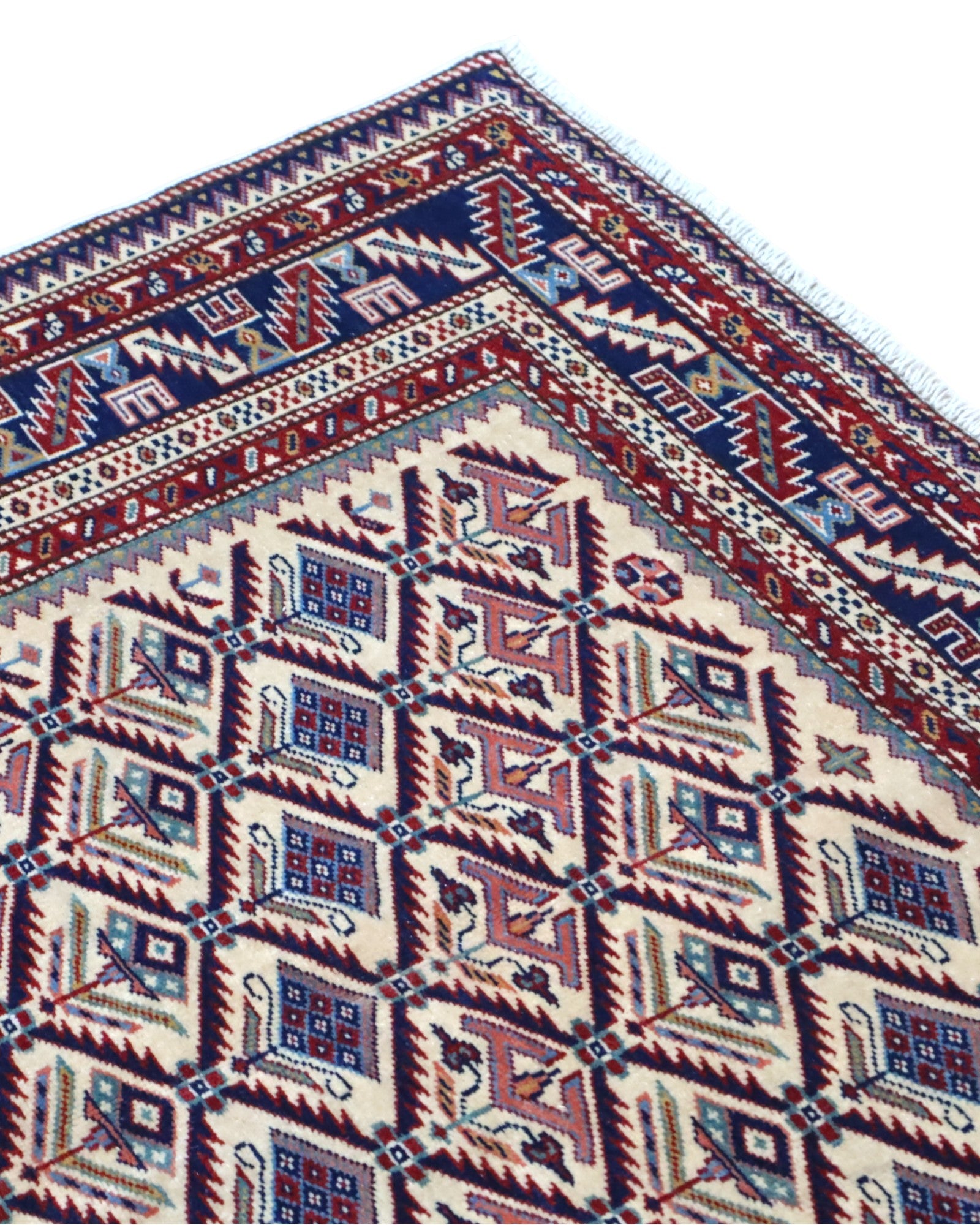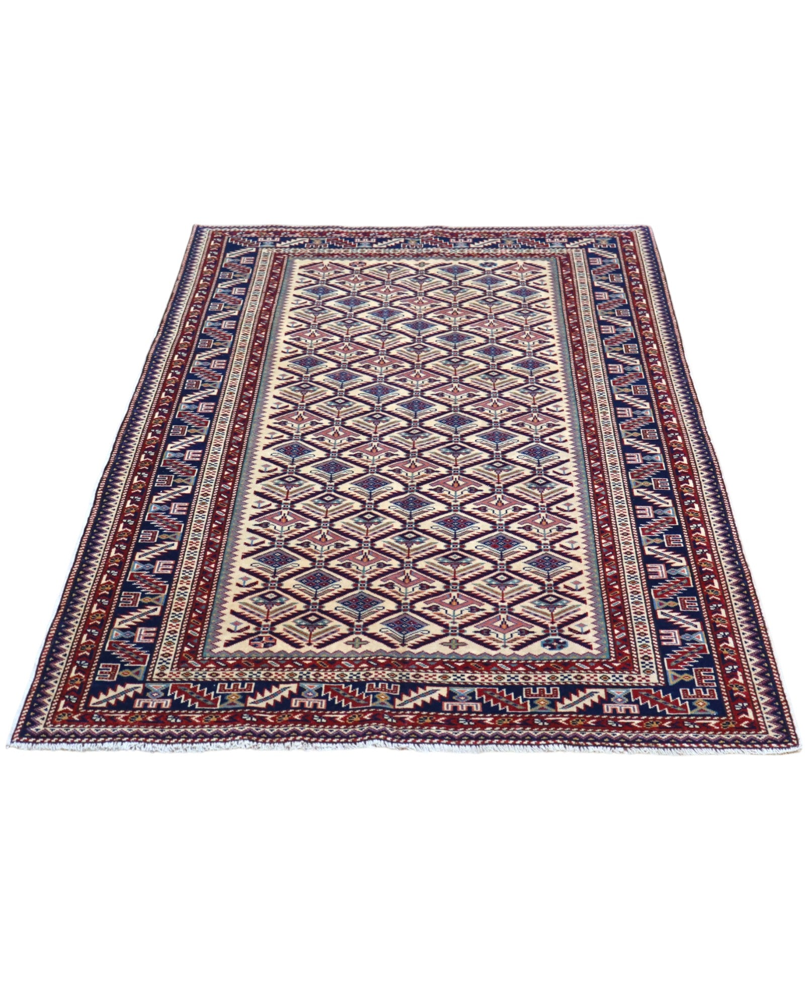 The 167x122 cm Shirvan rug features a repeating geometric design of interwoven diamonds , enclosing small stylized floral symbols, typical of Caucasian tradition. The light ivory background enhances the color contrasts with midnight blue and deep red, while the frame is enriched with zigzag motifs and friezes characteristic of the Shirvan school.