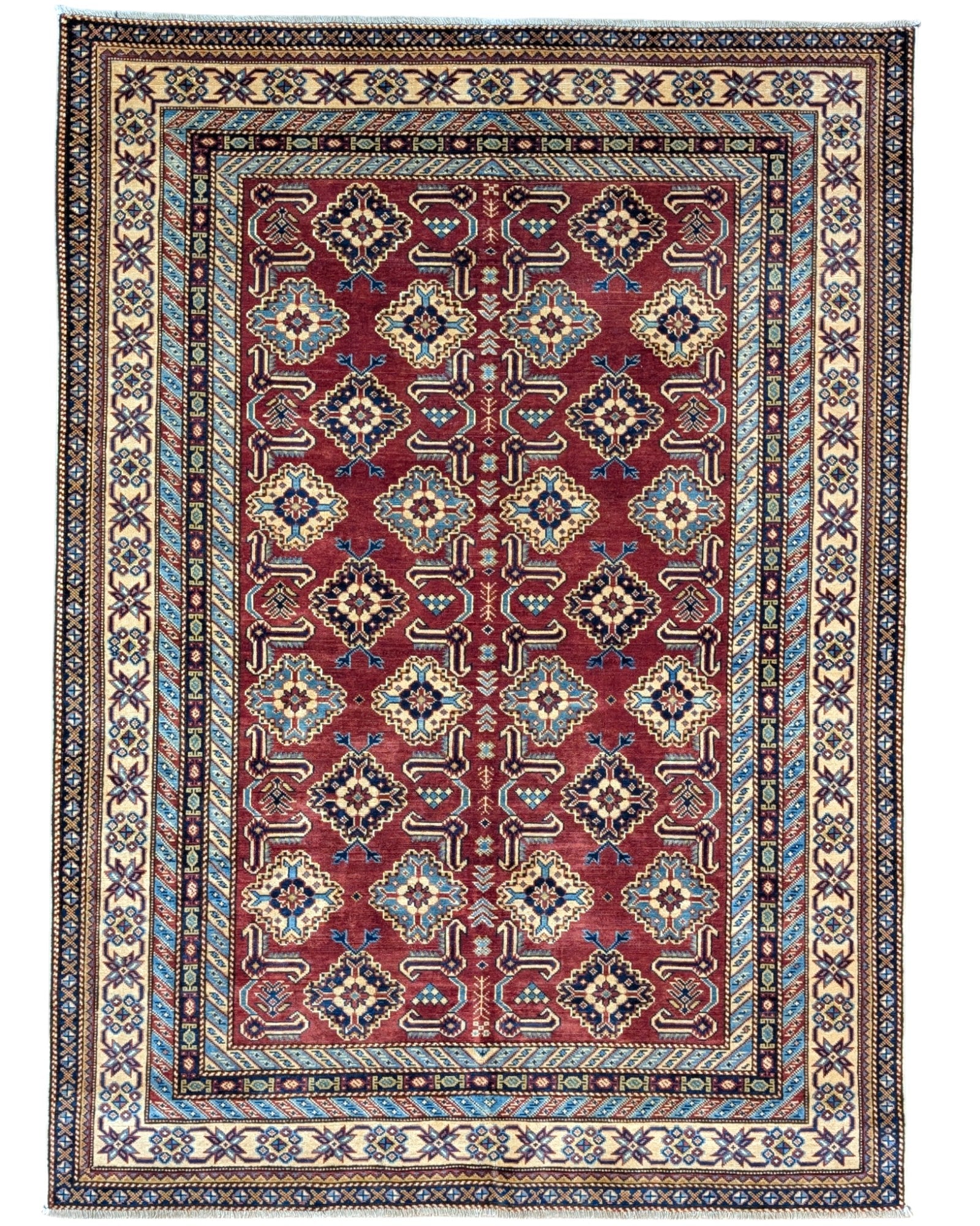 The design features a deep red field enriched by a classic, delicate geometric pattern. The beige border, with its elaborate motifs, creates an elegant contrast and envelops the entire design in a charming and welcoming visual harmony. The plant-based colors give the rug an authentic depth and beauty that will last over time.