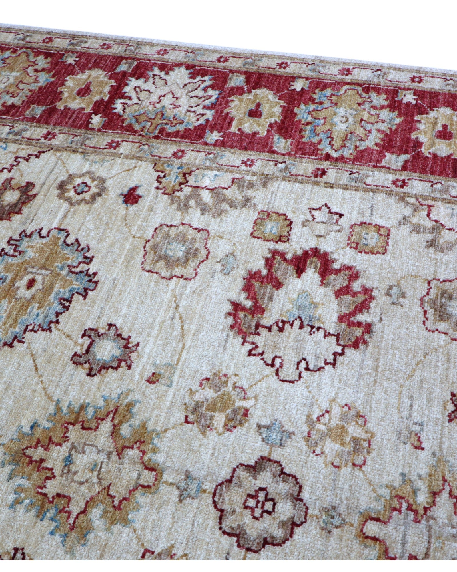 The design features a light beige background, adorned with decorative and harmonious floral motifs. The red border, with its elegant and detailed swirls, creates a refined contrast and envelops the entire design in a charming and welcoming visual harmony. The plant-based colors give the rug a chromatic depth and authentic beauty that will enchant you for years to come.