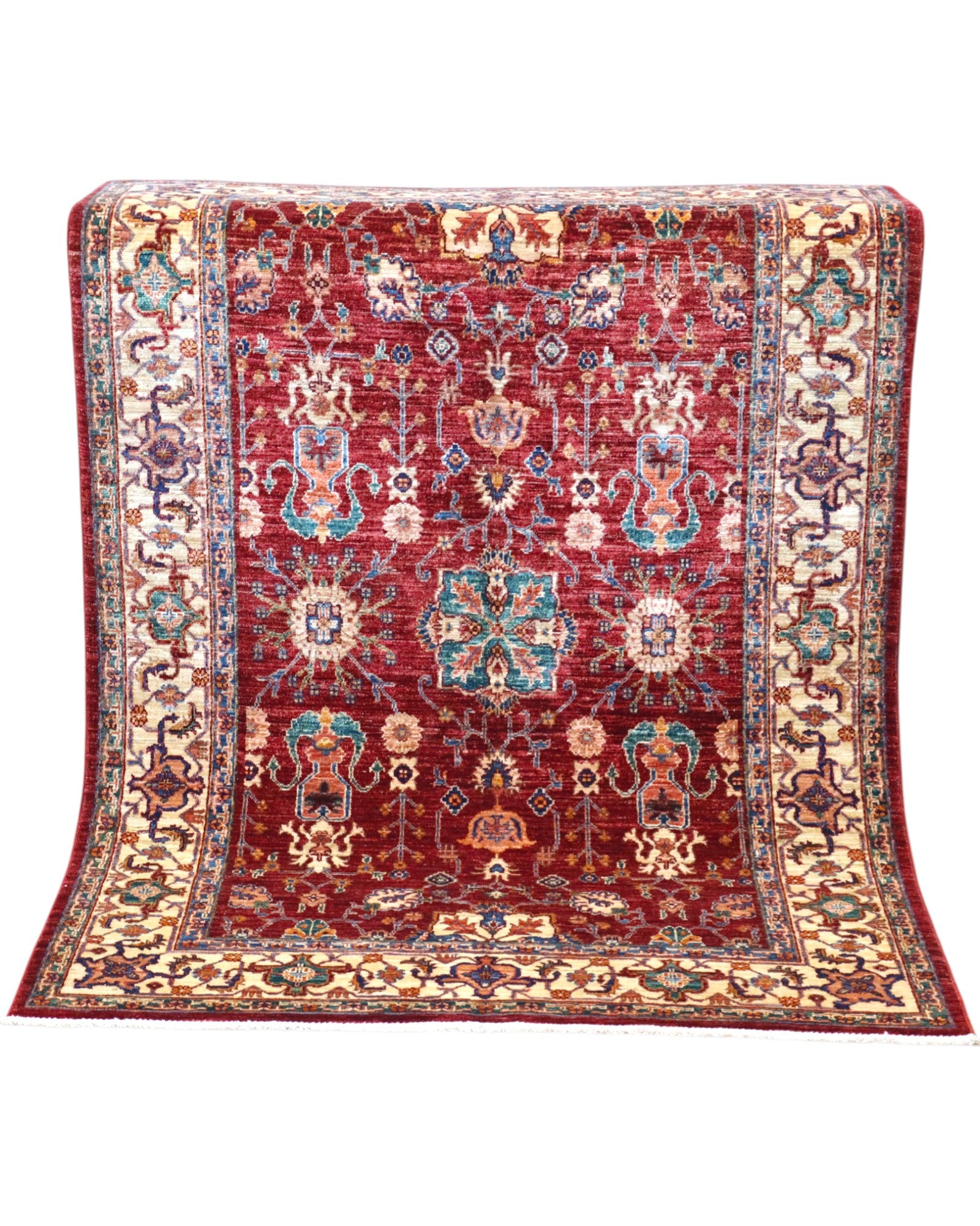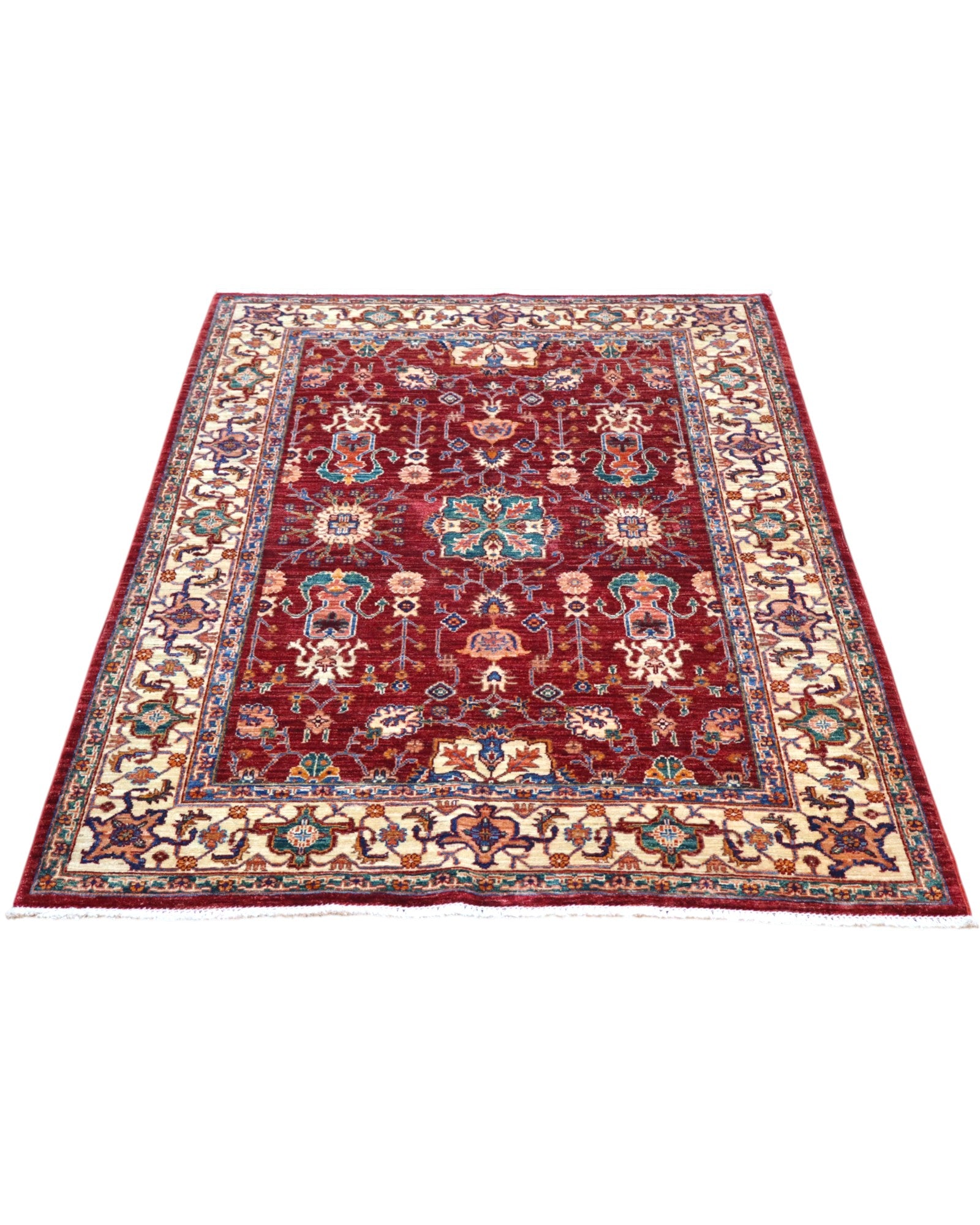 Il Tappeto Farahan 176x127 cm incarna l'eleganza intramontabile della tradizione persiana. Con il suo design complesso e ricco di dettagli, questo tappeto presenta un gioco di motivi floreali e geometrici in tonalità calde di rosso, blu e verde, che si intrecciano su uno sfondo beige con bordi decorativi in oro.