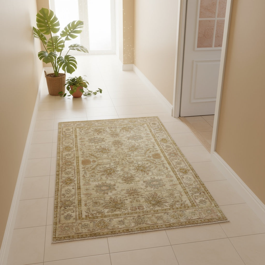 Il tappeto Ziegler 185x120 cm è un capolavoro di eleganza discreta, ideale per chi desidera un tocco raffinato e luminoso nei propri ambienti. Il disegno floreale, tipico della tradizione Ziegler, si sviluppa armoniosamente su un fondo beige chiaro, creando un effetto visivo delicato e naturale. La bordura, nelle stesse sfumature tenui di avorio e sabbia, incornicia il tappeto con equilibrio e sobrietà.