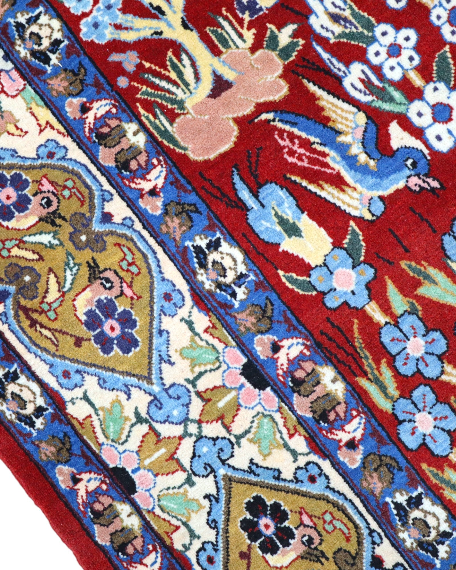 Sul fondo rosso melograno si sviluppa una scena fiabesca: un giardino rigoglioso popolato da alberi maestosi, cervi eleganti e uccelli in volo. Le sfumature naturali dei colori vegetali creano un effetto di profondità e movimento, mentre la ricchezza dei dettagli e la finezza dell’annodatura testimoniano una maestria senza tempo.