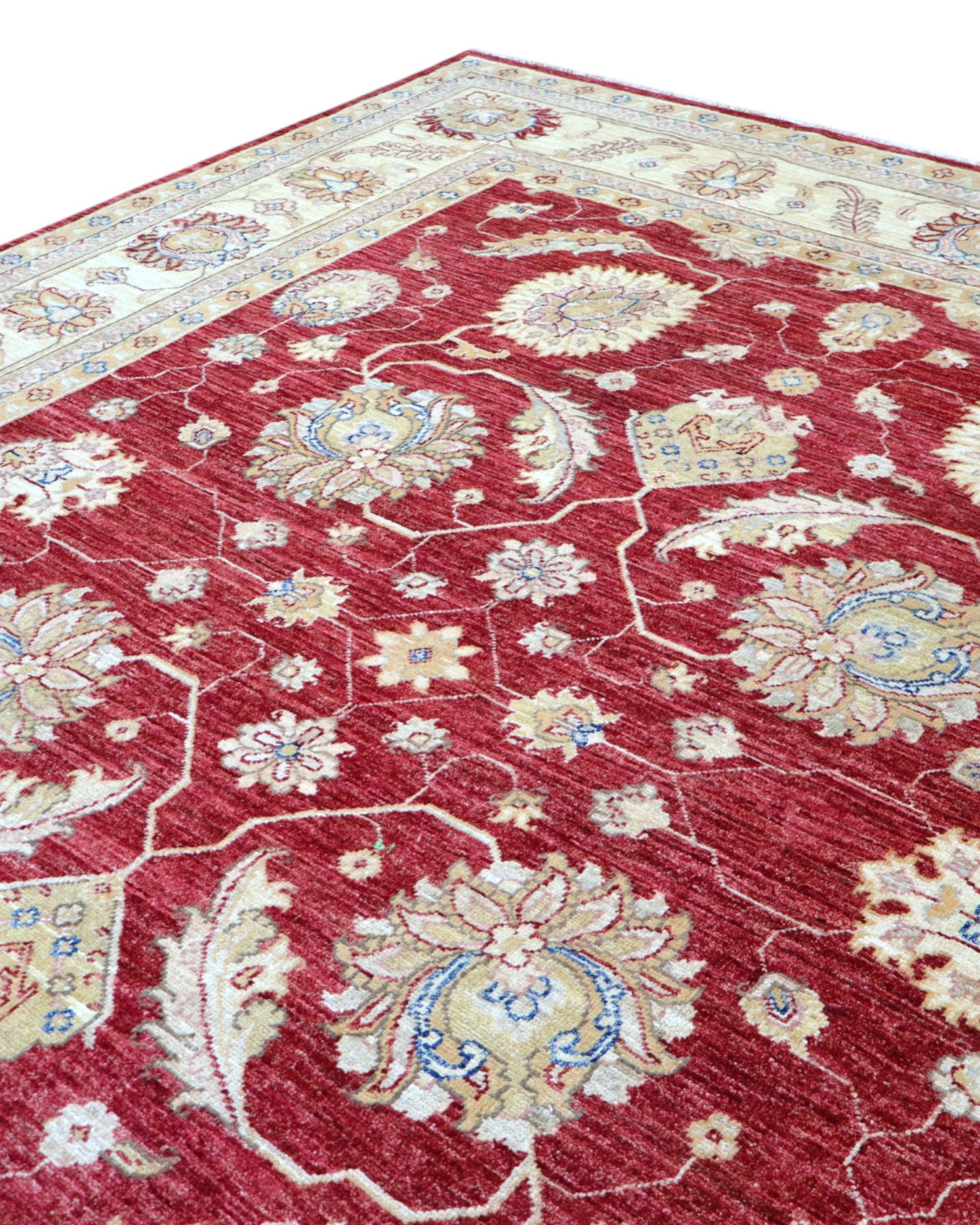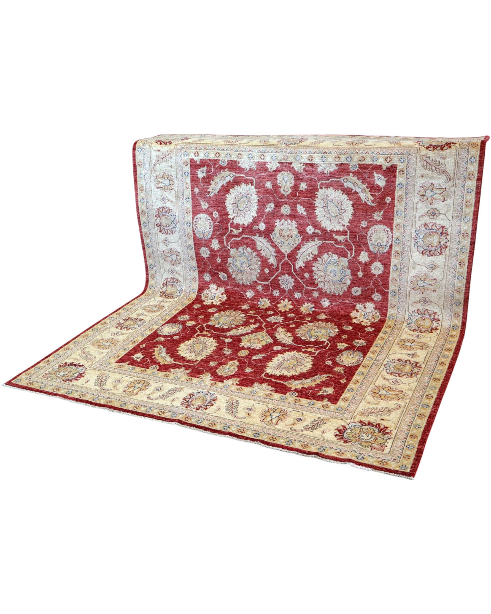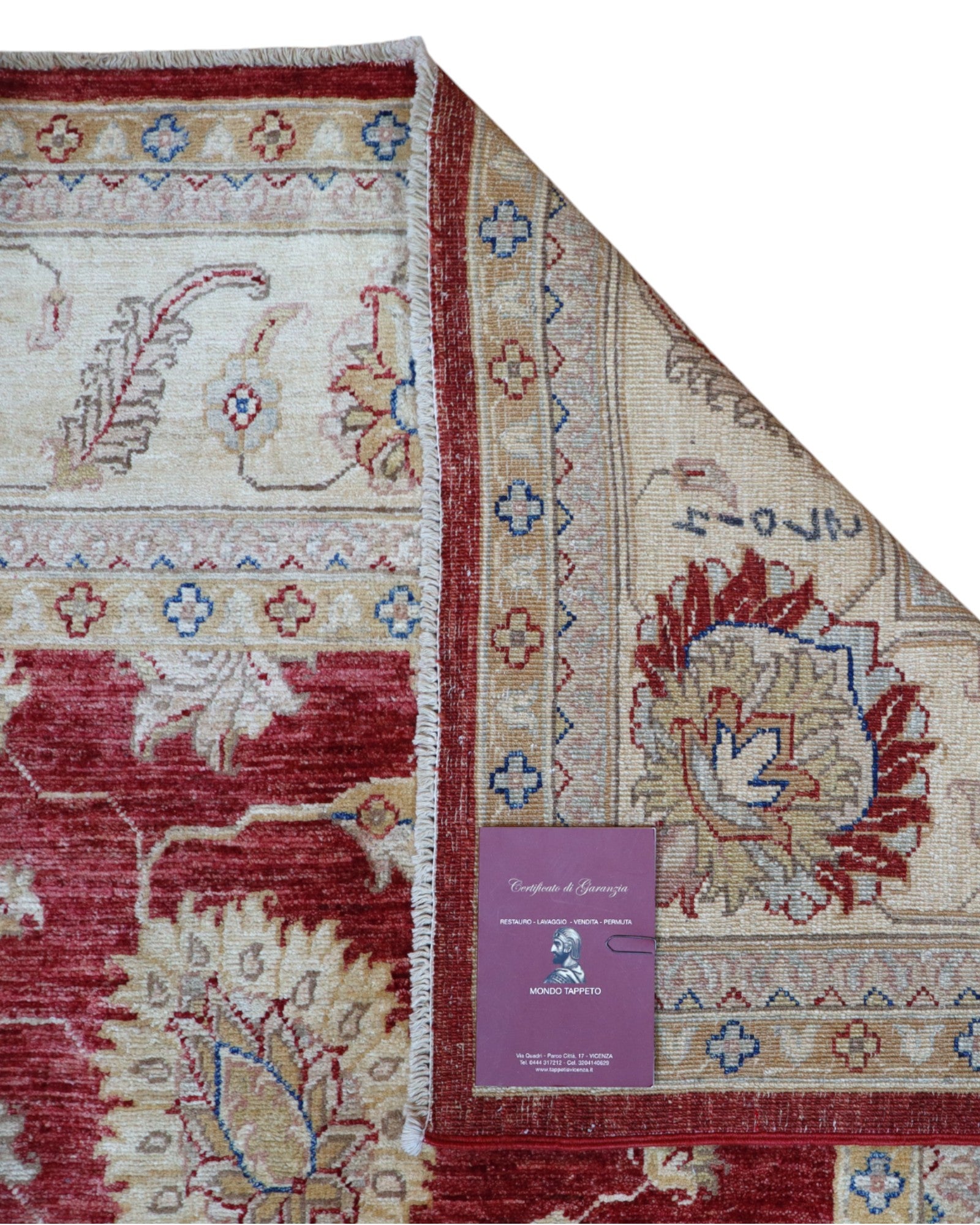 Questo tappeto Ziegler è un'autentica espressione di arte e maestria artigianale. È stato annodato a mano sul telaio tradizionale da esperti artigiani, con trama e ordito in cotone resistente e vello in pura lana tinta con colori vegetali.