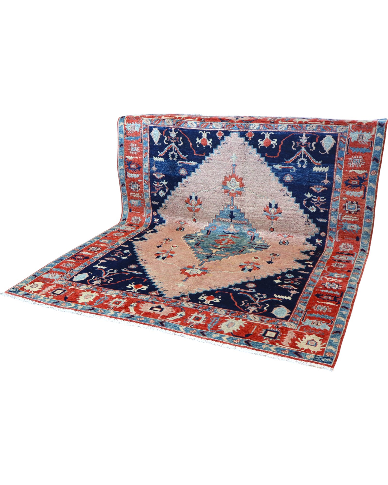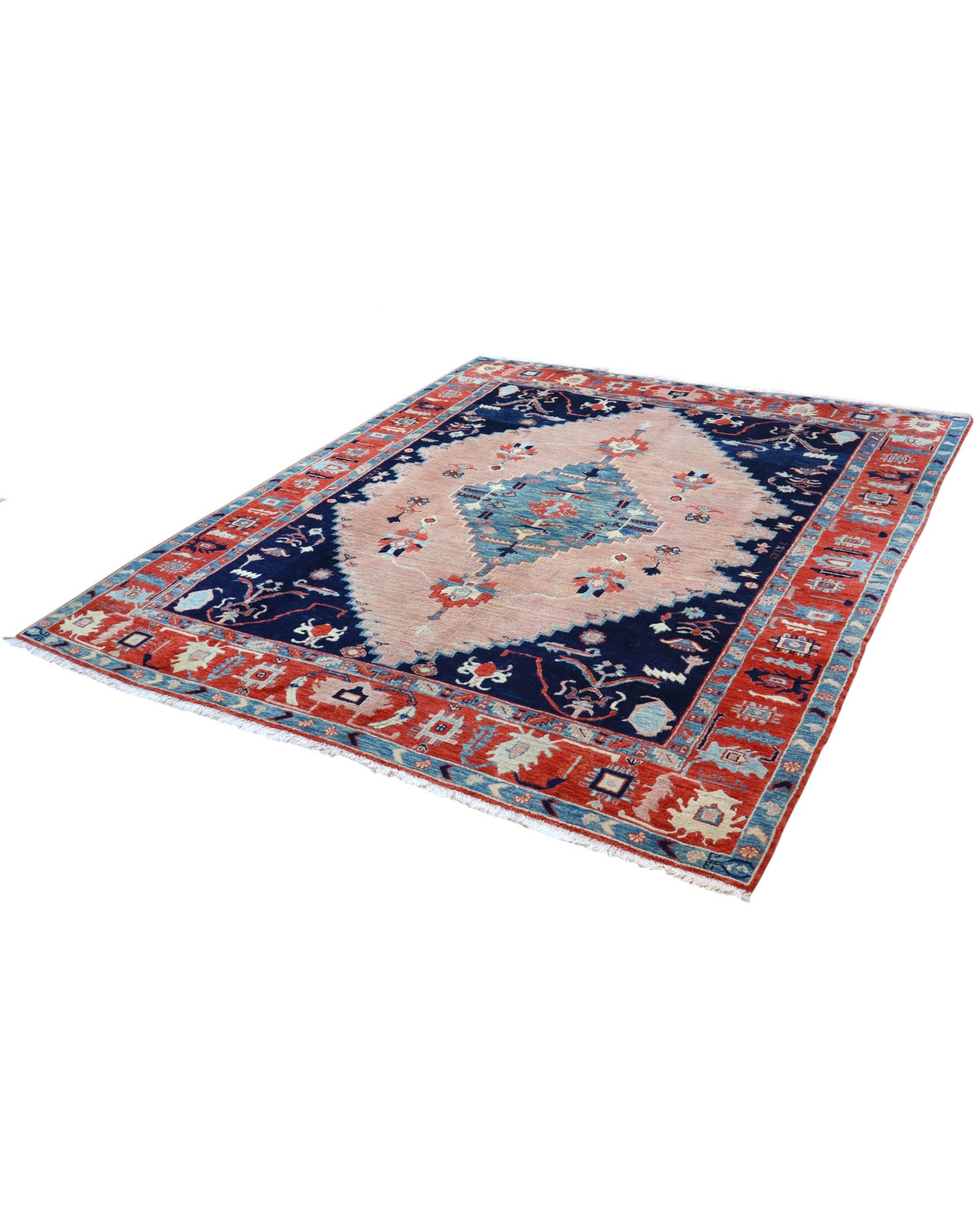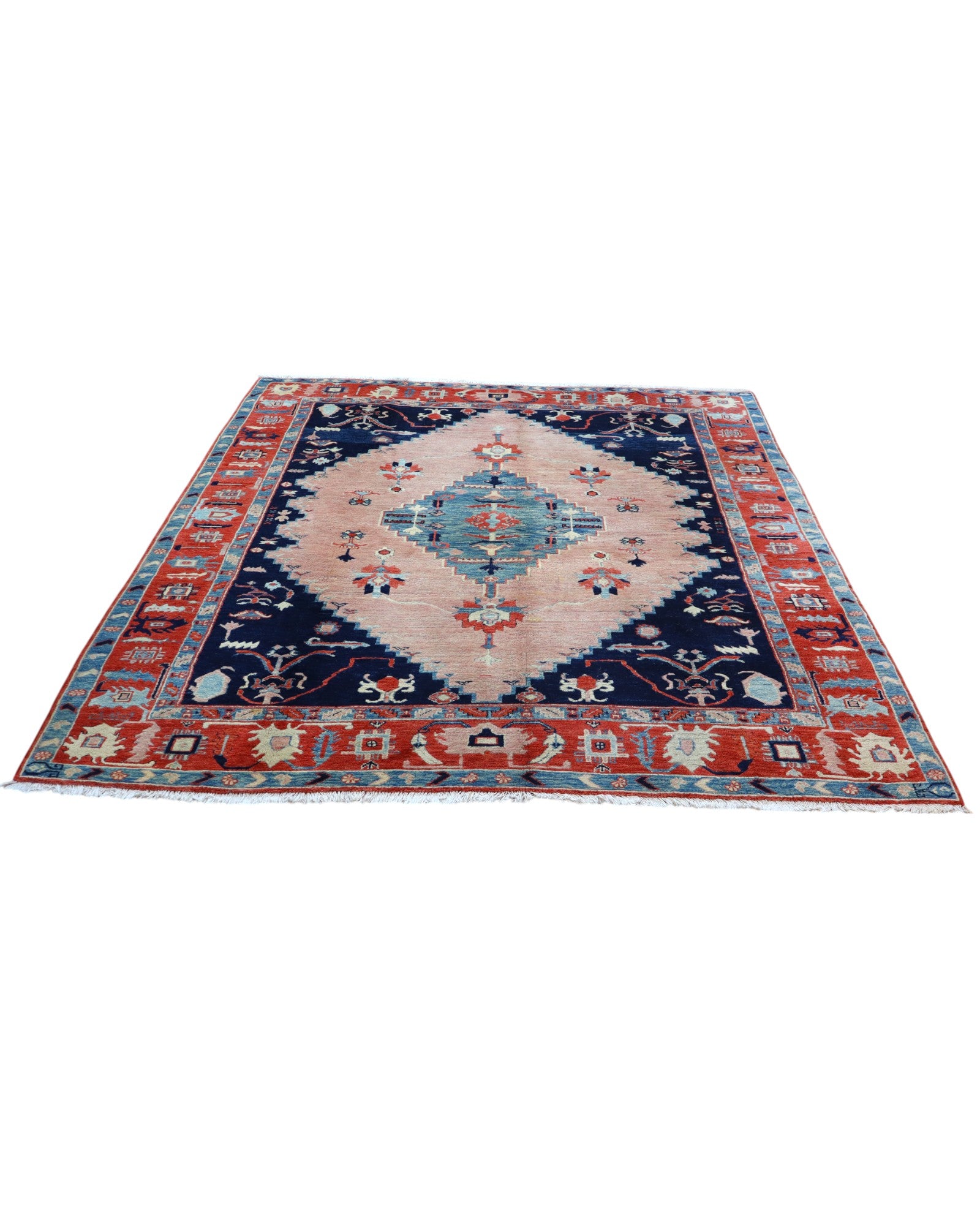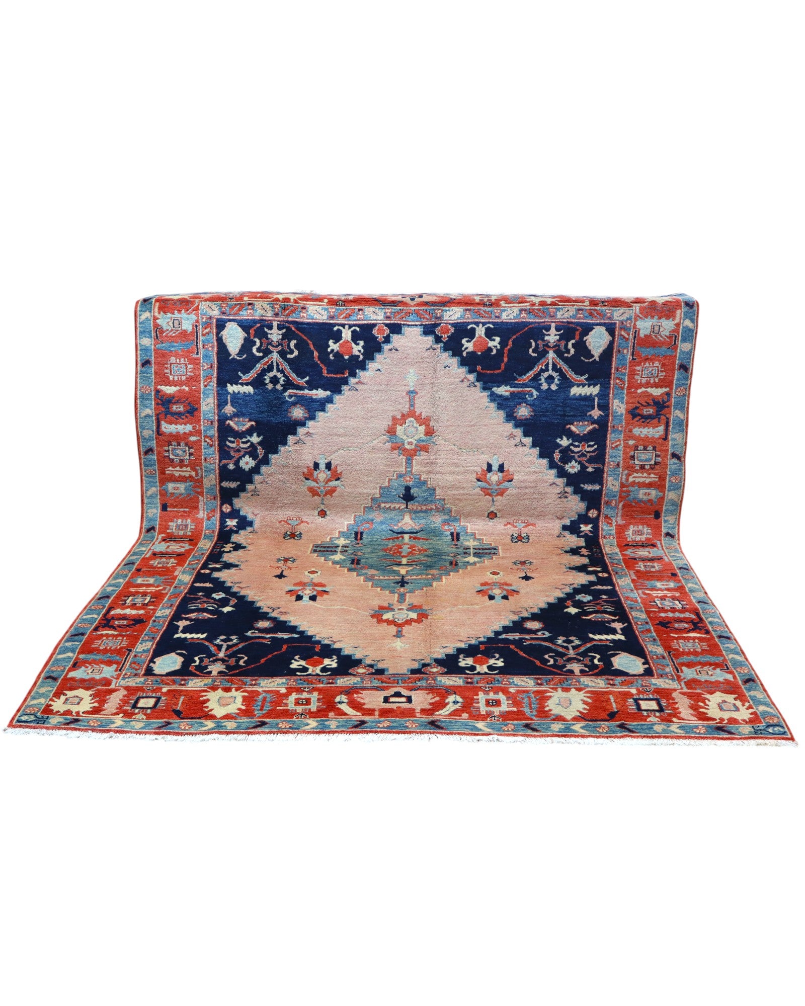 Il design si distingue per un fondo nel sofisticato colore beige, sul quale si sviluppa un intricato motivo geometrico, tipico dei tappeti Heriz, con elementi che richiamano la profondità del blu notte. La cornice in un caldo rosso mattone, riccamente decorata, crea un contrasto deciso ed elegante, avvolgendo l'intero tappeto in un'armonia visiva imponente e accogliente. I colori vegetali donano al tappeto una profondità e una bellezza autentiche che si manterranno inalterate nel tempo.