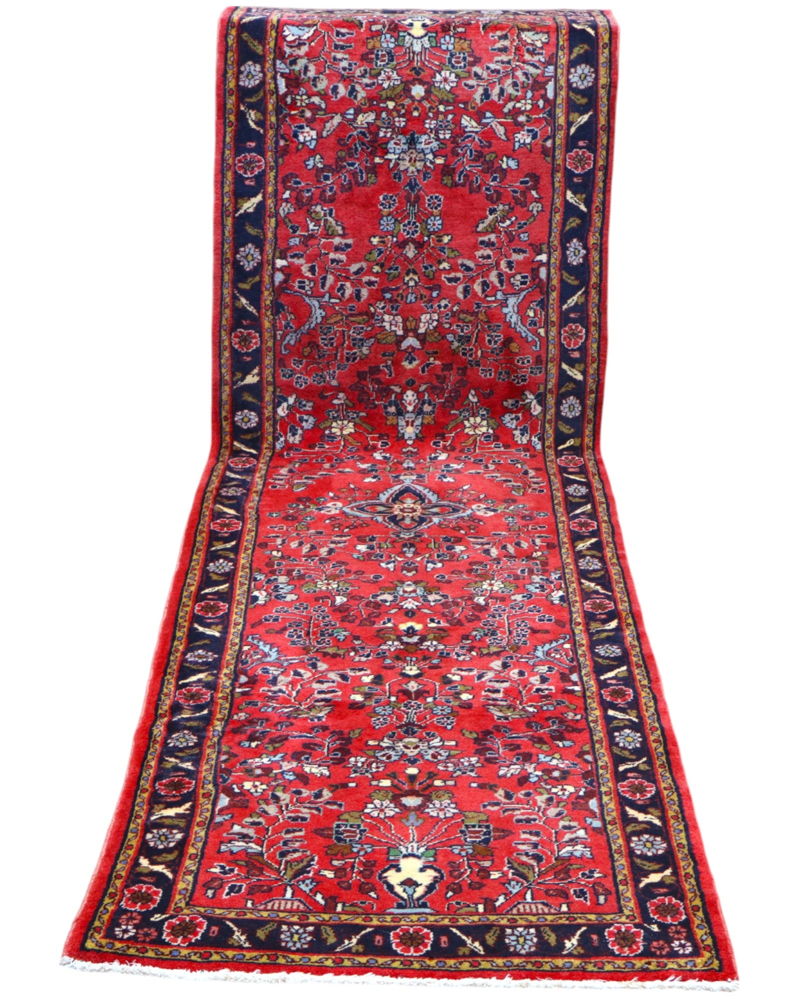 Il design si distingue per un fondo nel profondo colore rosso antico, che evoca storie e tradizioni millenarie. Elegantemente racchiuso da una cornice blu, il tappeto è arricchito da motivi decorativi che si snodano con armonia lungo la sua lunghezza, creando un ritmo visivo affascinante. La combinazione di tonalità e la ricchezza dei dettagli conferiscono a questa passatoia un'eleganza intrinseca e un'aura di raffinata bellezza.