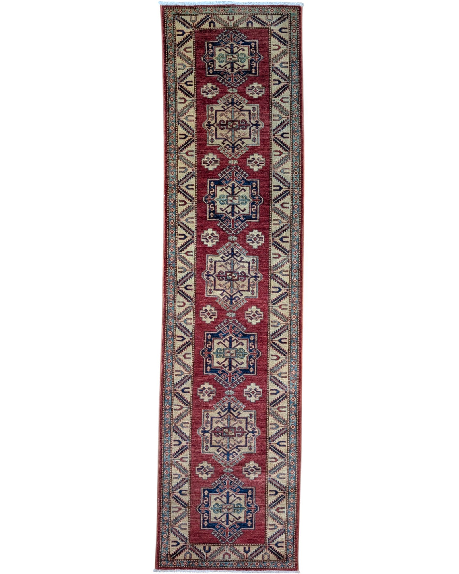 Questa passatoia Kazak è un'autentica espressione di arte e maestria artigianale. Annodata a mano sul telaio tradizionale da esperti artigiani, con trama e ordito in cotone resistente e un vello in pura lana tinta con colori vegetali. Con le sue dimensioni di 317 x 80 cm, questo pezzo si rivela un esemplare di notevole bellezza e squisita fattura.
