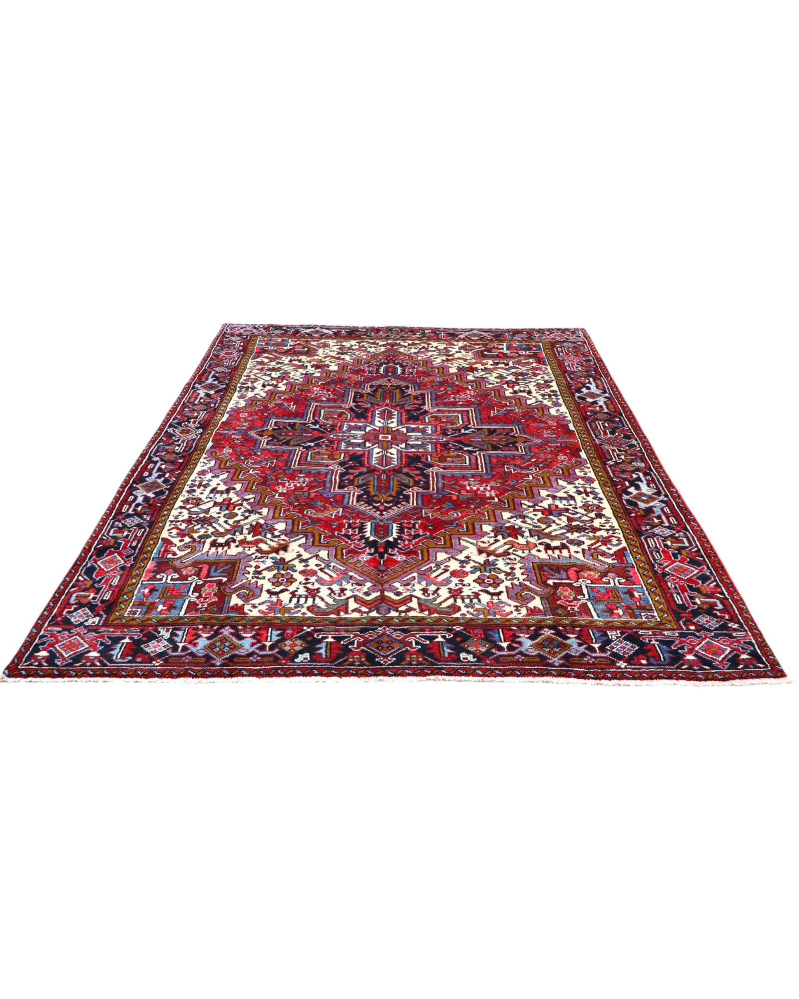 Il design presenta un campo beige, sul quale si sviluppa un intricato motivo geometrico, tipico dei tappeti Heriz, spesso centrato su un grande medaglione poligonale e motivi angolari elaborati. La cornice rossa, con i suoi disegni geometrici e floreali stilizzati, crea un contrasto deciso ed elegante, avvolgendo l'intero tappeto in un'armonia visiva imponente e accogliente. I colori vegetali donano al tappeto una profondità e una bellezza autentiche che si manterranno inalterate nel tempo.