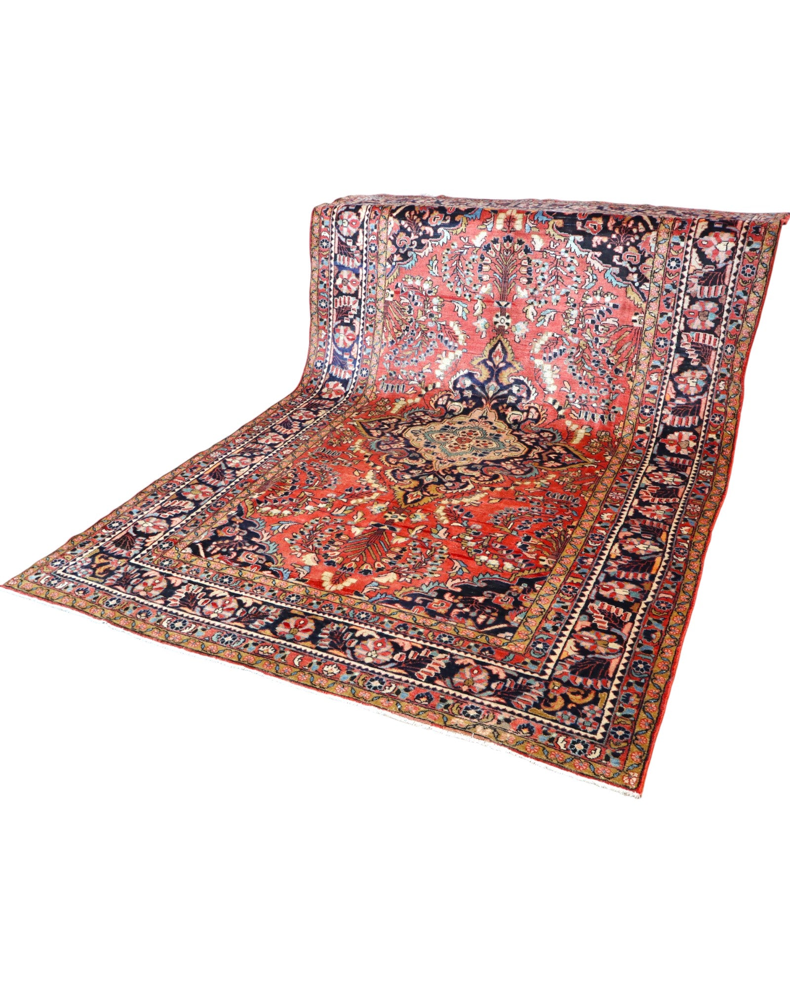 Il Tappeto Liliyan 346 x 224 cm rappresenta uno dei più affascinanti esempi dell’arte tessile persiana della regione di Arak. Il suo fondo rosa antico, caratteristico della produzione Liliyan, accoglie un ricco intreccio di motivi floreali e palmette stilizzate, che si sviluppano con ritmo armonioso attorno a un medaglione centrale dalla palette blu e avorio.