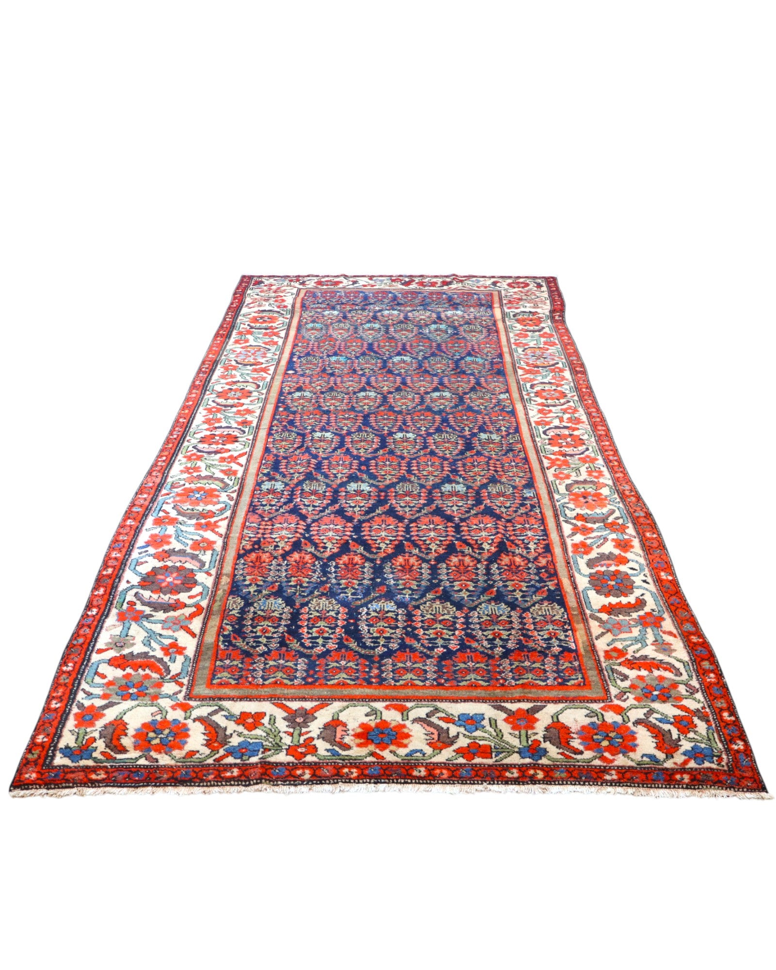 Questo tappeto Malayer antico è tramato ed annodato a mano su telai tradizionali da esperti artigiani, con trama e ordito in cotone resistente e vello in pura lana tinta con colori vegetali. Con le sue imponenti dimensioni di 350 x 176 cm, rappresenta un esemplare raro e prezioso della tradizione persiana.