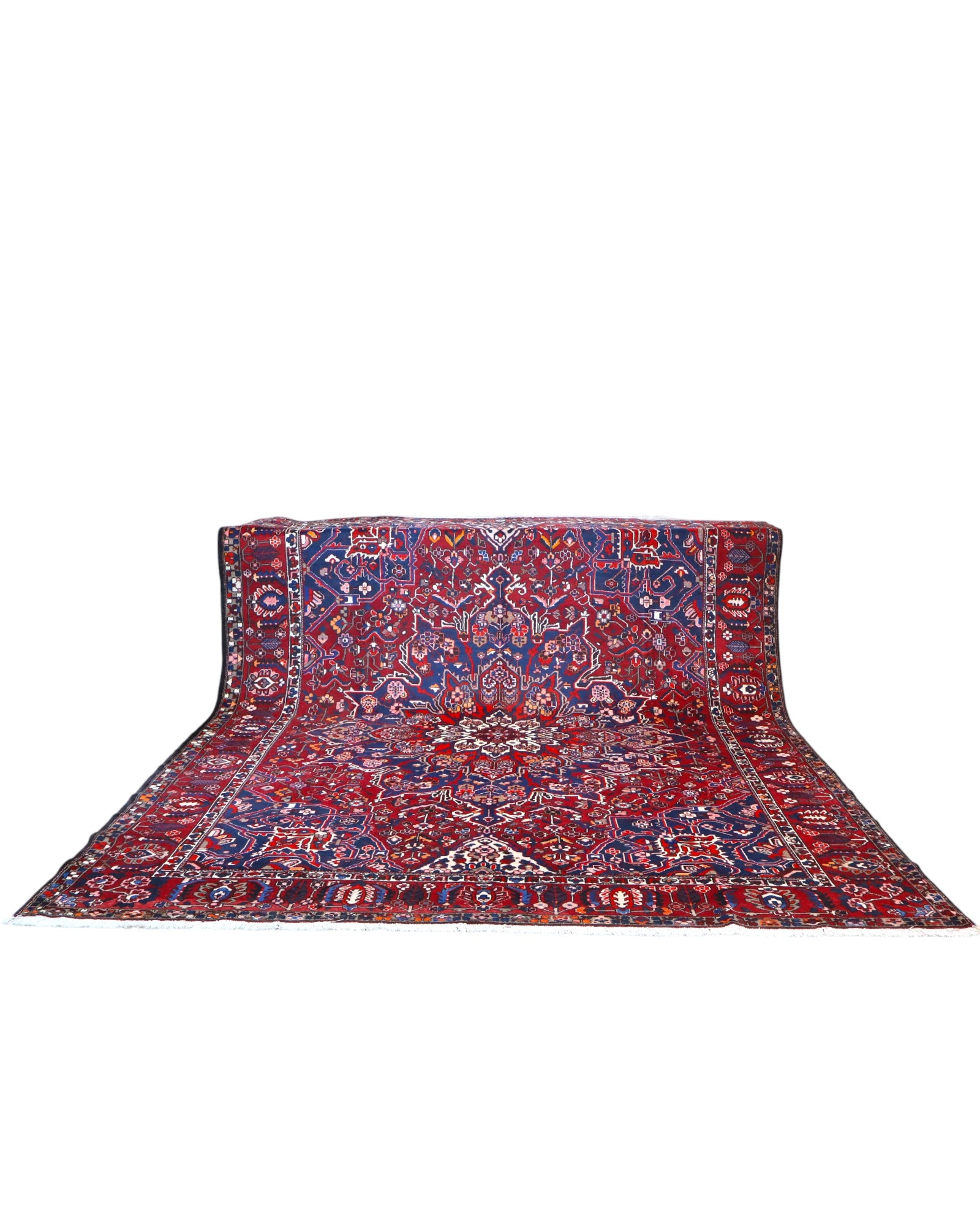 Il tappeto Bakhtiary 380x304 cm è un magnifico esempio di arte persiana tradizionale, con un grande medaglione centrale floreale che si irradia armoniosamente sul campo rosso. I dettagli blu e avorio, accompagnati da una cornice riccamente decorata, esaltano il contrasto cromatico e donano profondità alla composizione.