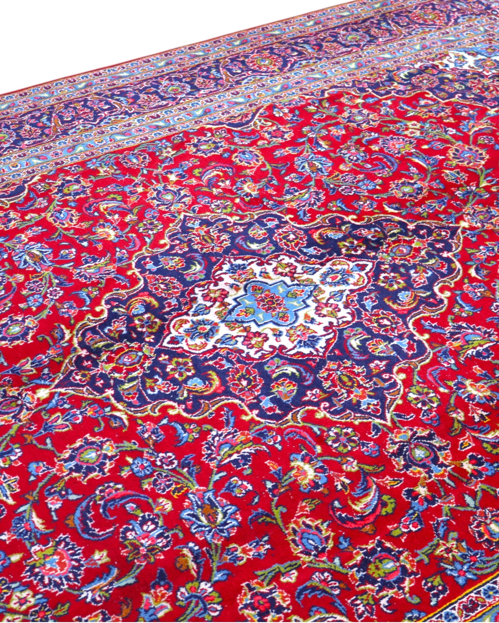 Un magnifico tappeto Kashan di grandi dimensioni, autentico capolavoro della tradizione persiana. Il campo centrale, in un intenso rosso rubino, è impreziosito da un raffinato medaglione floreale in blu e avorio, contornato da un’esuberanza di motivi arabescati che si intrecciano con armonia su tutta la superficie.