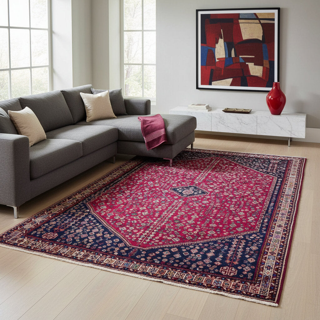 Il Tappeto Abadeh 301x200 cm è un autentico esempio della tradizione persiana, caratterizzato da un grande medaglione centrale geometrico su intenso fondo rosso. Gli angoli blu scuro e la ricca bordura decorativa incorniciano armoniosamente il campo centrale, arricchito da numerosi piccoli motivi geometrici tipici della manifattura Abadeh.