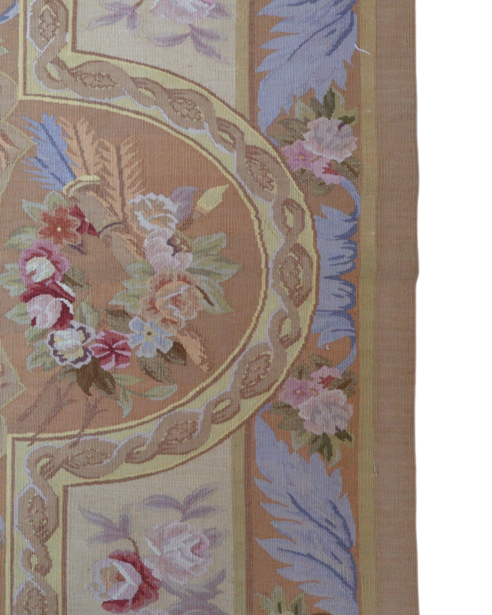 Il design si ispira allo stile classico francese Aubusson, con un fondo chiaro decorato da elaborati motivi floreali in tonalità oro, beige e pastello. La complessità delle cornici ornamentali e la delicatezza cromatica donano al tappeto un’eleganza sontuosa e senza tempo.