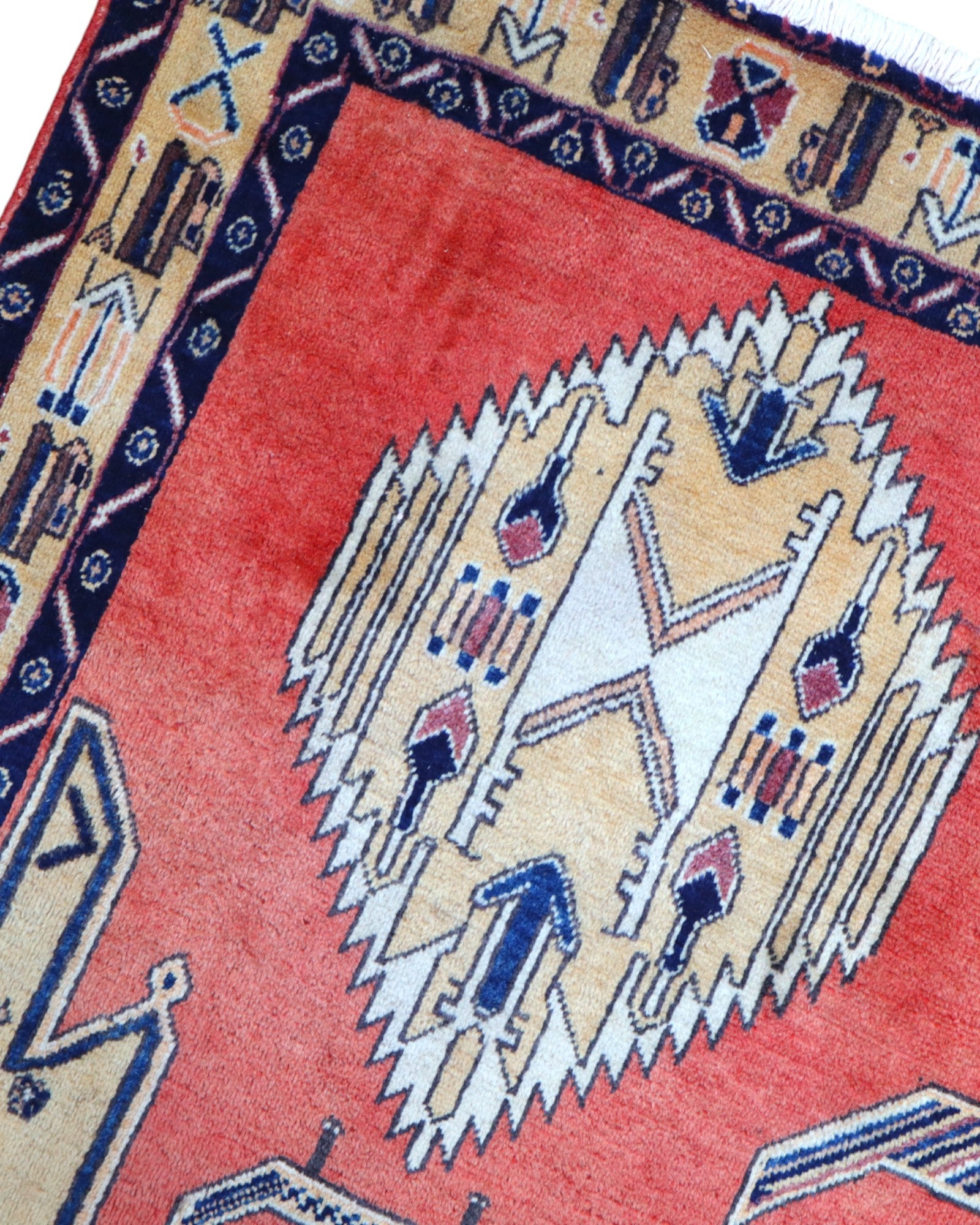 Il design si distingue per il suo campo arancione vibrante, sul quale si sviluppa un intricato motivo geometrico ricco di simbolismi e forme tradizionali. La complessità dei dettagli e l’armonia dei colori vegetali conferiscono profondità e autenticità, garantendo una bellezza che durerà nel tempo.