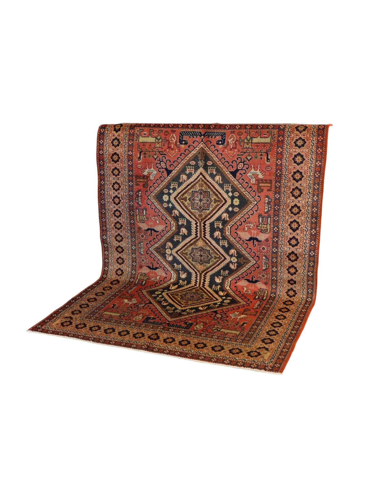 Il fondo rosso caldo è decorato con motivi centrali a forma di diamante, racchiusi da figure stilizzate di cammelli e altri animali, che portano una storia visiva e simbolica. La cornice in blu scuro e beige arricchisce il design, creando un contrasto elegante che valorizza la bellezza dei dettagli.