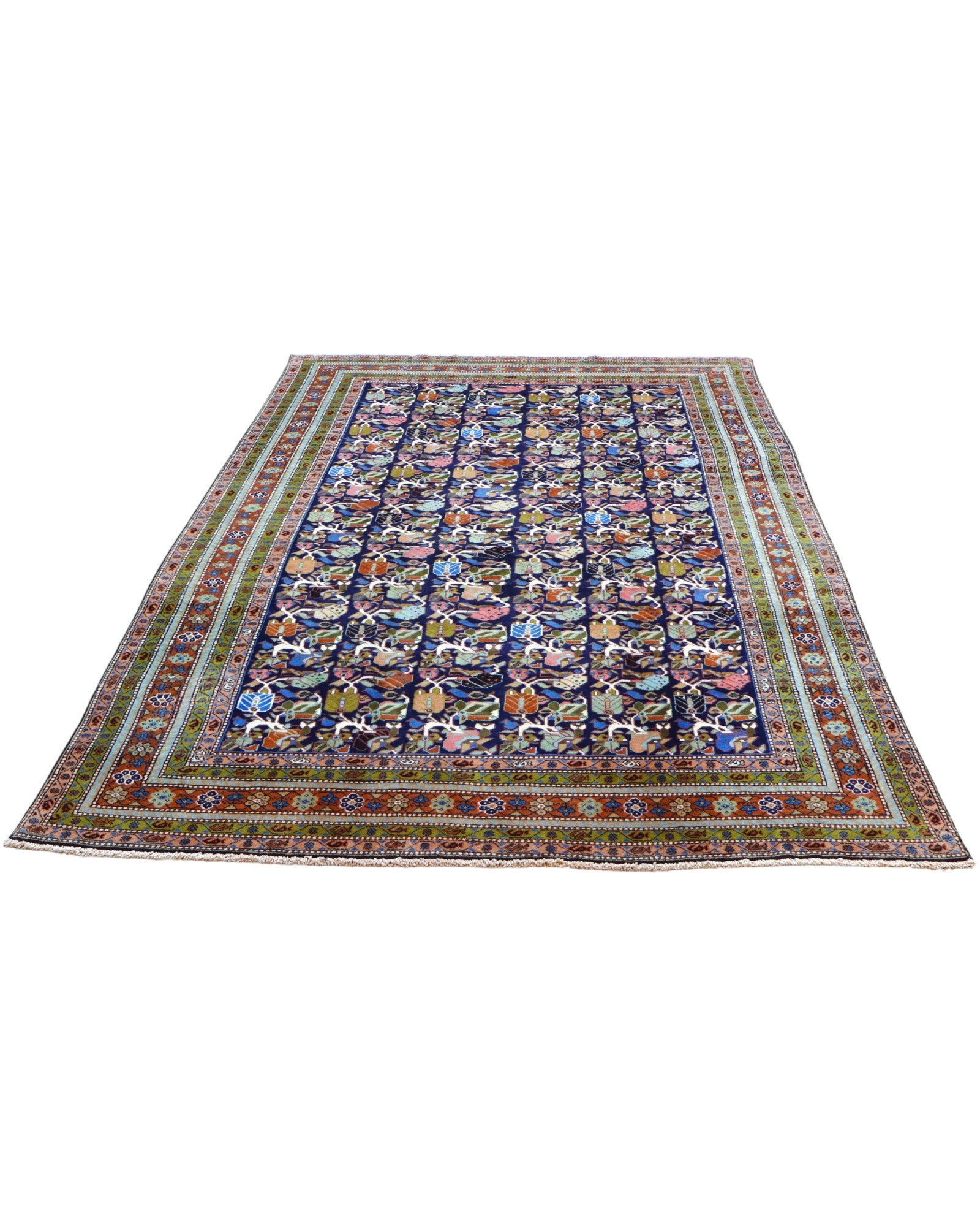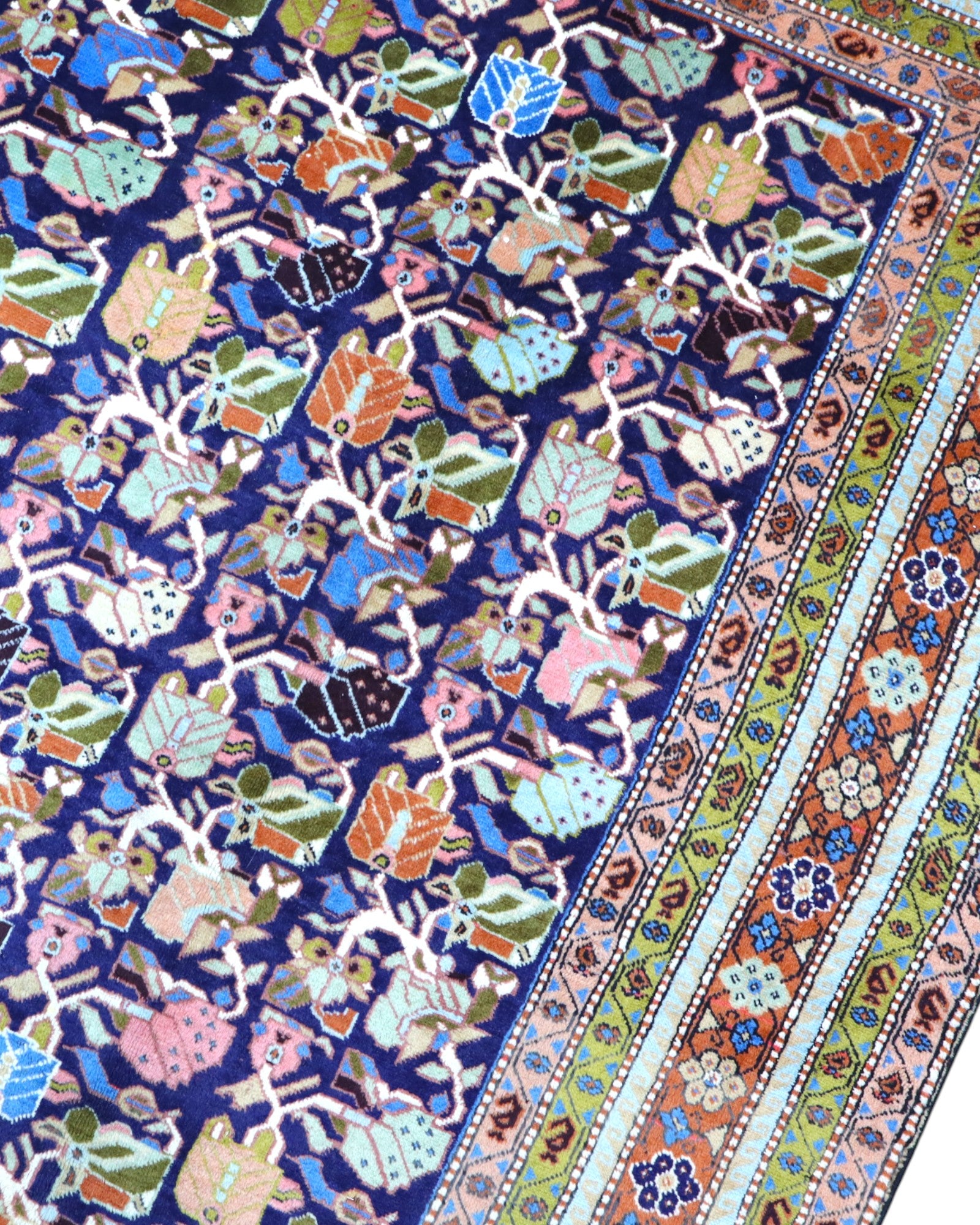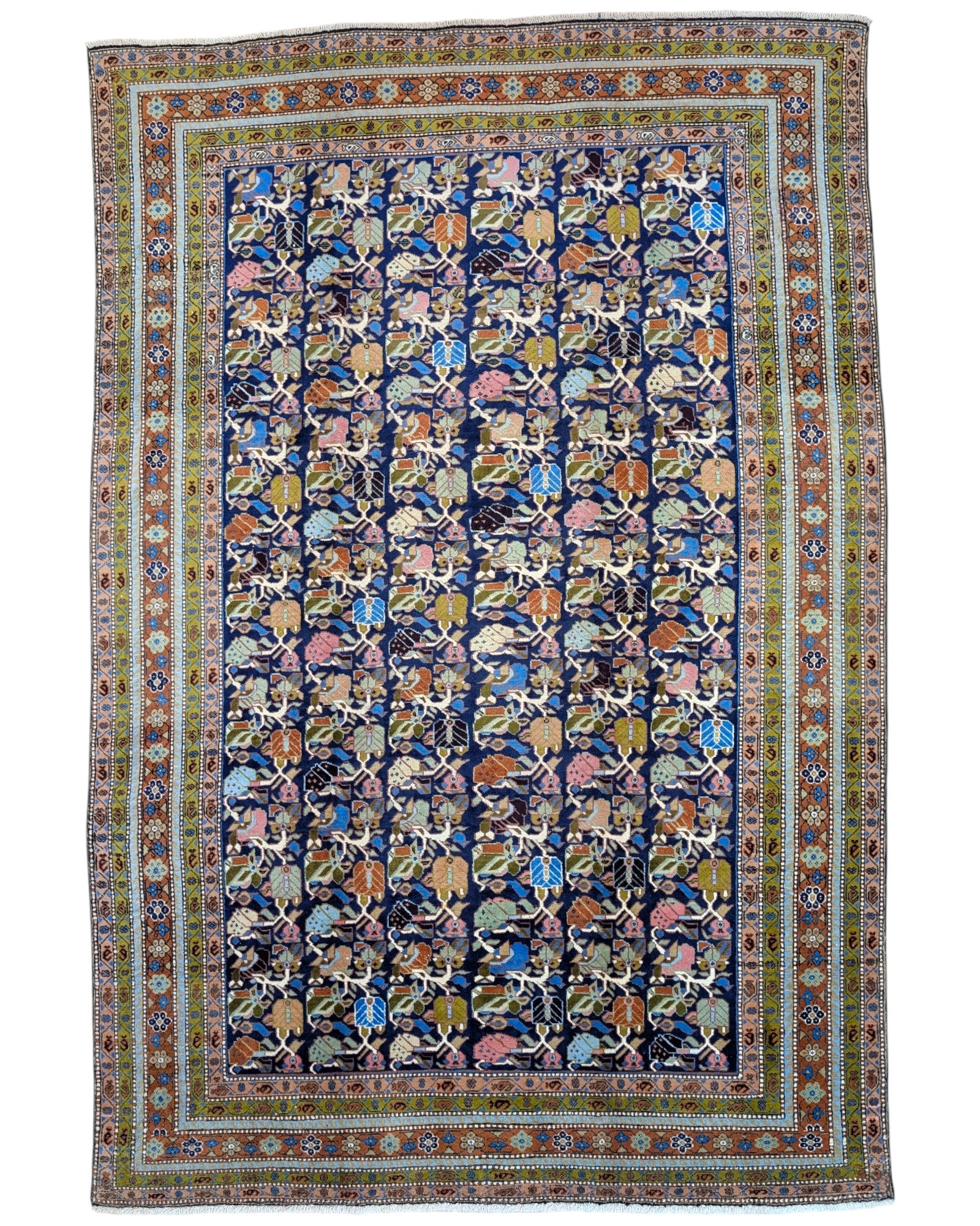 Questo elegante tappeto Ardebil è un esempio raffinato della tradizione persiana nord-occidentale, famoso per i suoi motivi ripetuti e per la straordinaria precisione decorativa. Il fondo blu scuro incornicia un’intricata sequenza di figure stilizzate, piccoli animali e motivi vegetali, ognuno tessuto con colori delicati come rosa, verde oliva, celeste e crema. Il risultato è un disegno vivace ma armonioso, che richiama l’arte miniaturistica persiana.