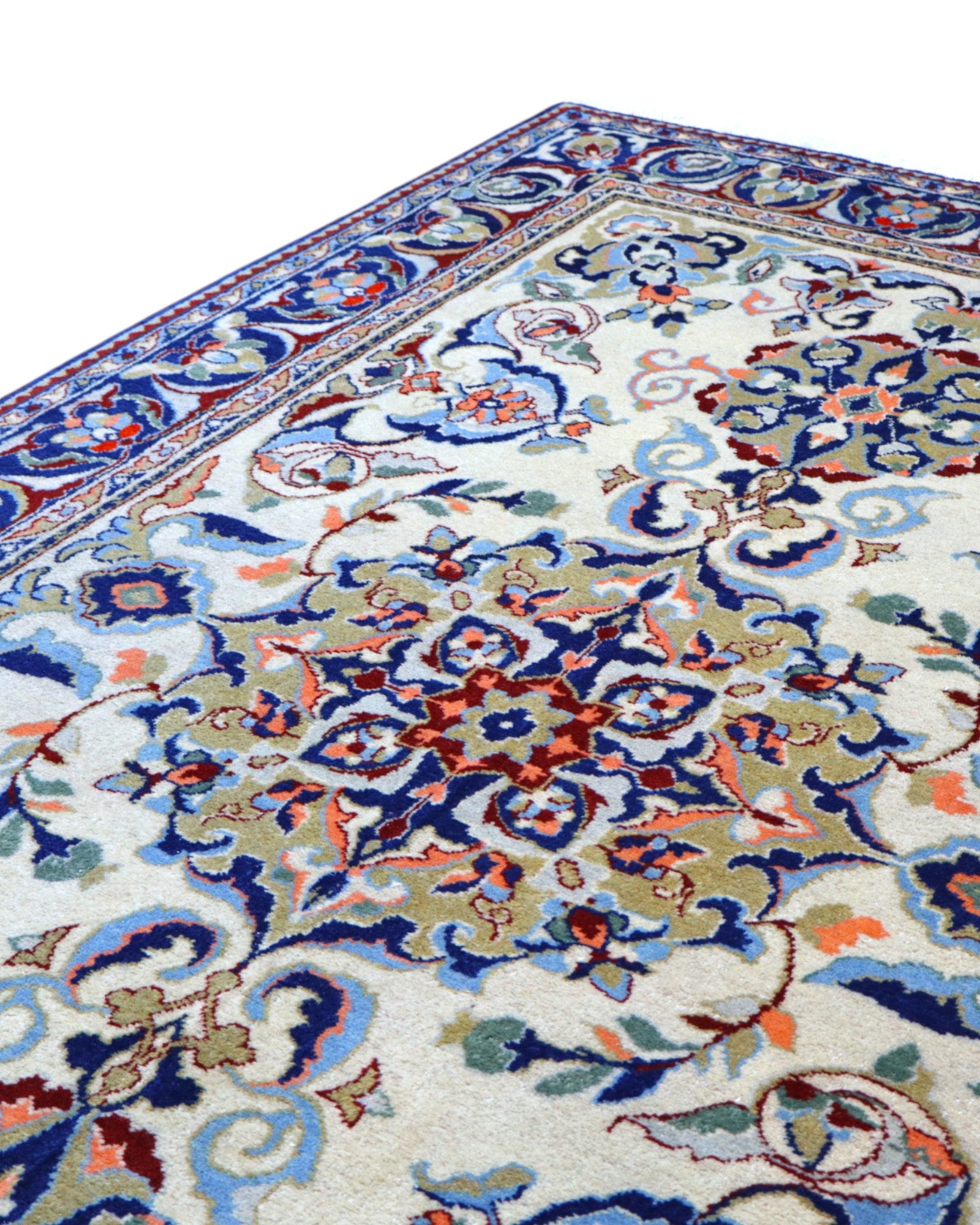 Il design si distingue per un intricato motivo floreale e decorativo su fondo beige, arricchito da una cornice blu elegantemente ornata, che crea un contrasto armonioso e conferisce equilibrio visivo al tappeto. La combinazione di colori vegetali e dettagli raffinati garantisce una profondità cromatica e una bellezza duratura nel tempo.