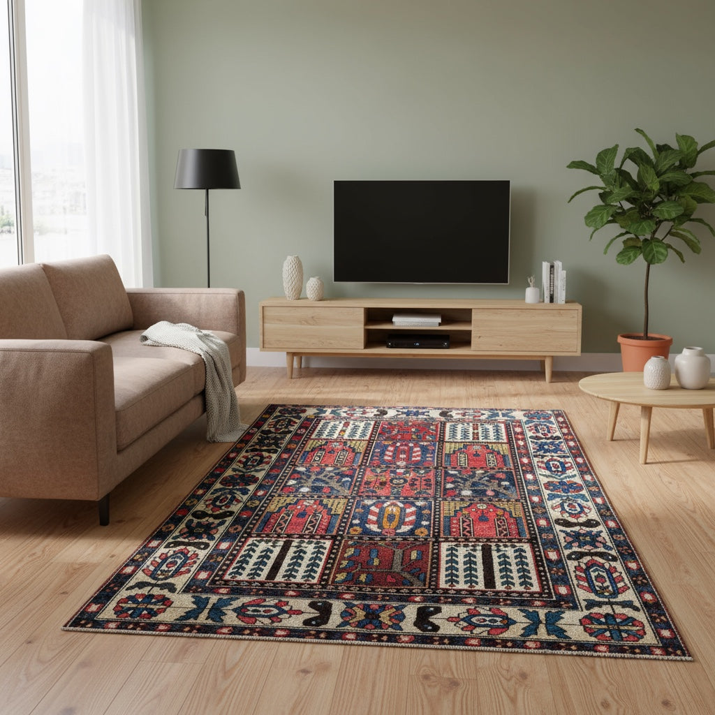 Il design presenta un elegante fondo rosso mattone suddiviso in distinti pannelli decorativi che richiamano l'iconico “disegno a giardino” o “khesti”, ciascuno con motivi geometrici e stilizzati. La ricchezza dei dettagli e l’armonia dei colori vegetali conferiscono al tappeto profondità, eleganza e un fascino senza tempo.