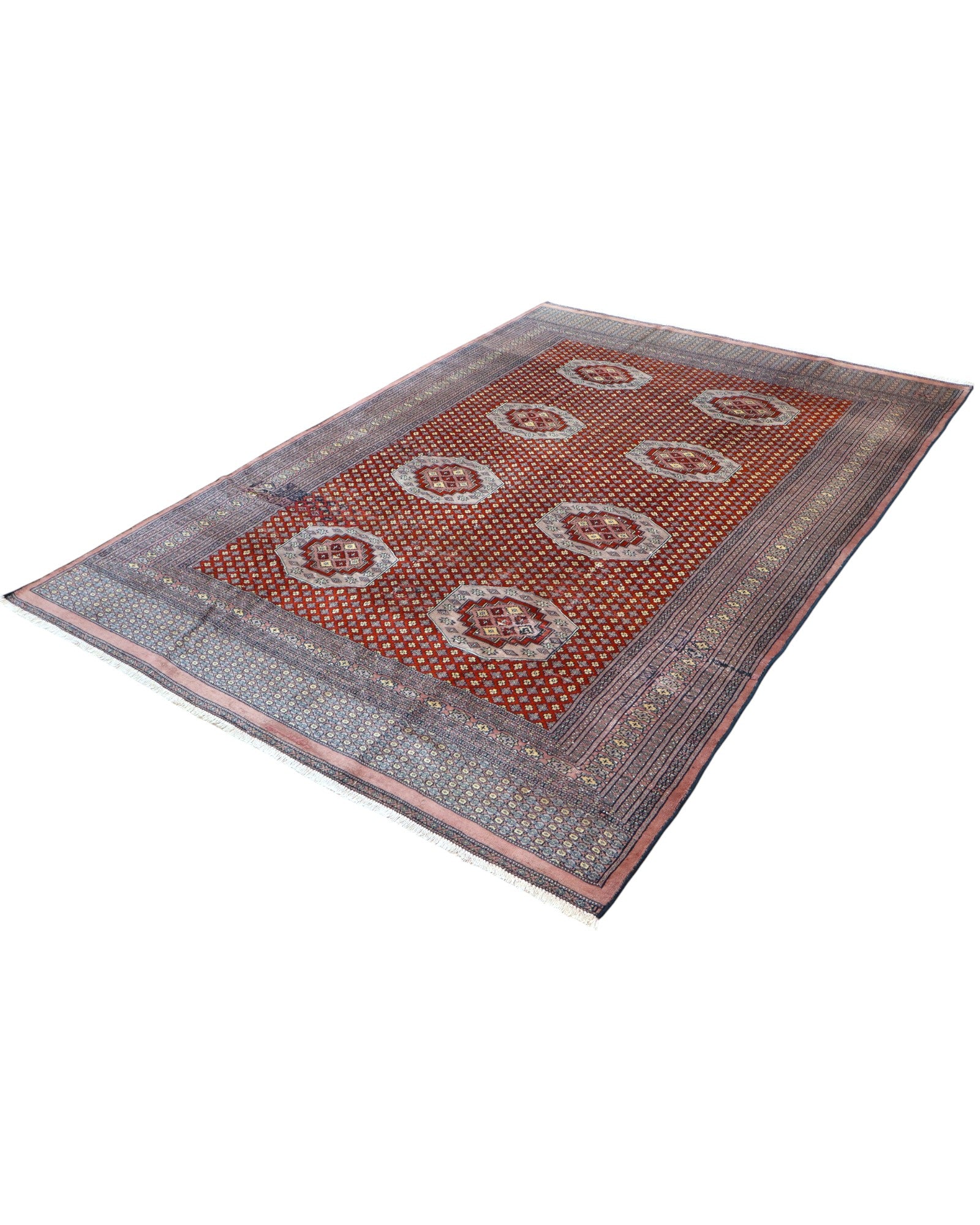 Questo elegante tappeto Bukhara pakistano presenta il classico disegno a gul, disposto in file ordinate che valorizzano la simmetria e la purezza del motivo tribale. Il campo rosso ruggine ospita gli iconici ottagoni geometrici dai toni crema e bordeaux, arricchiti da intricati decori interni, tipici dell’arte tessile delle popolazioni dell’Asia Centrale.