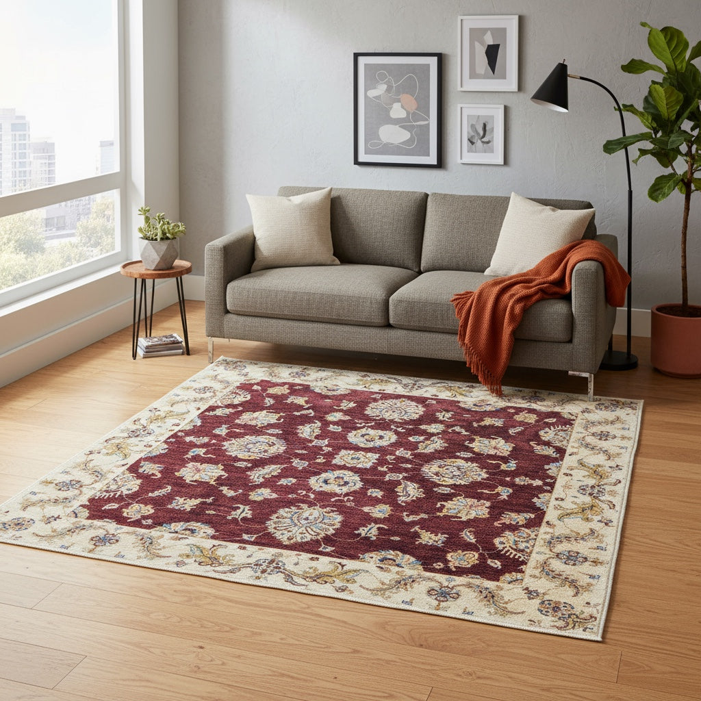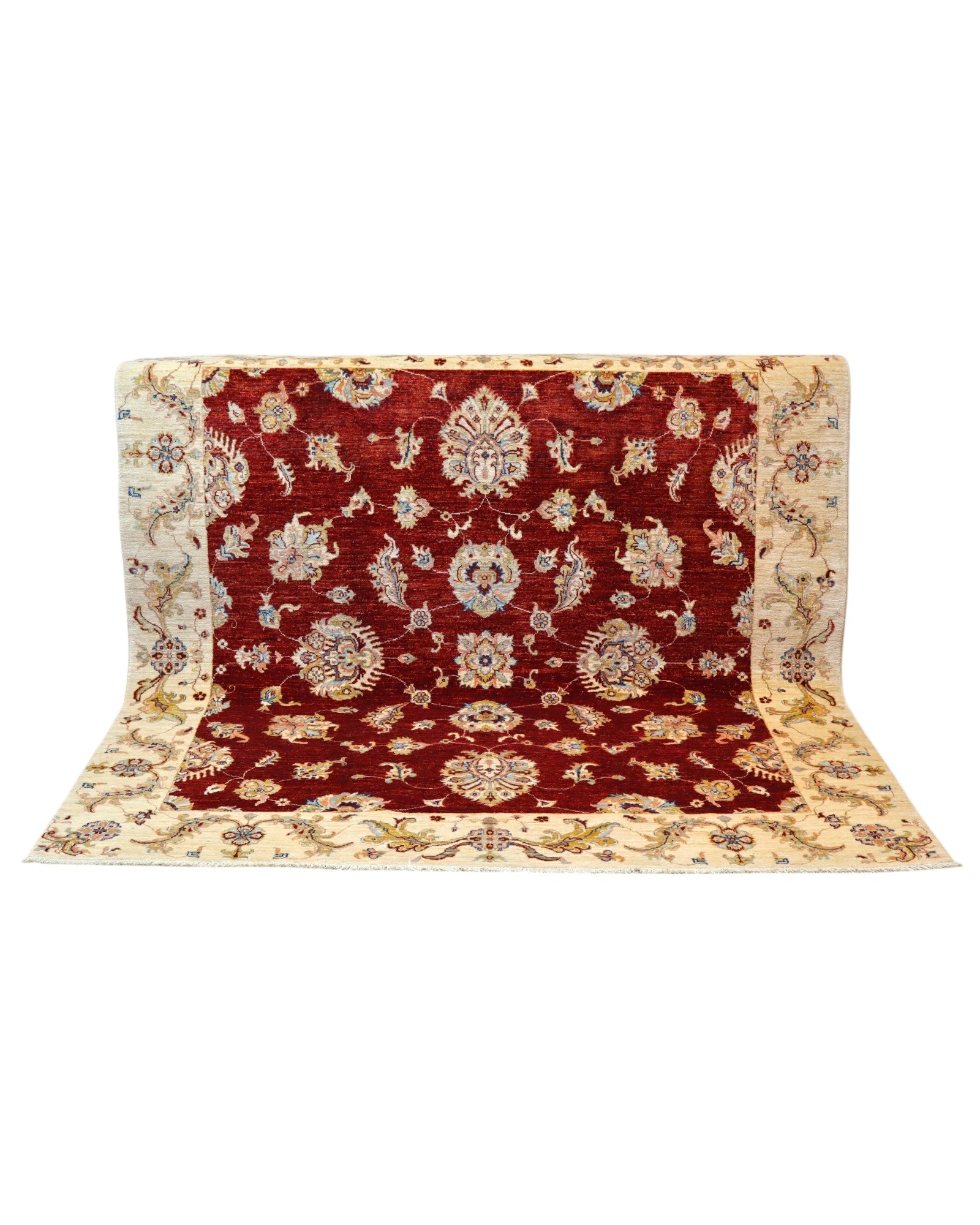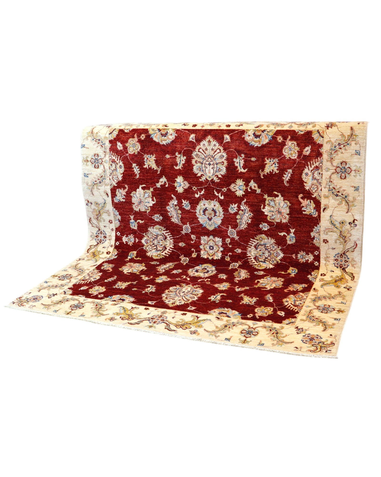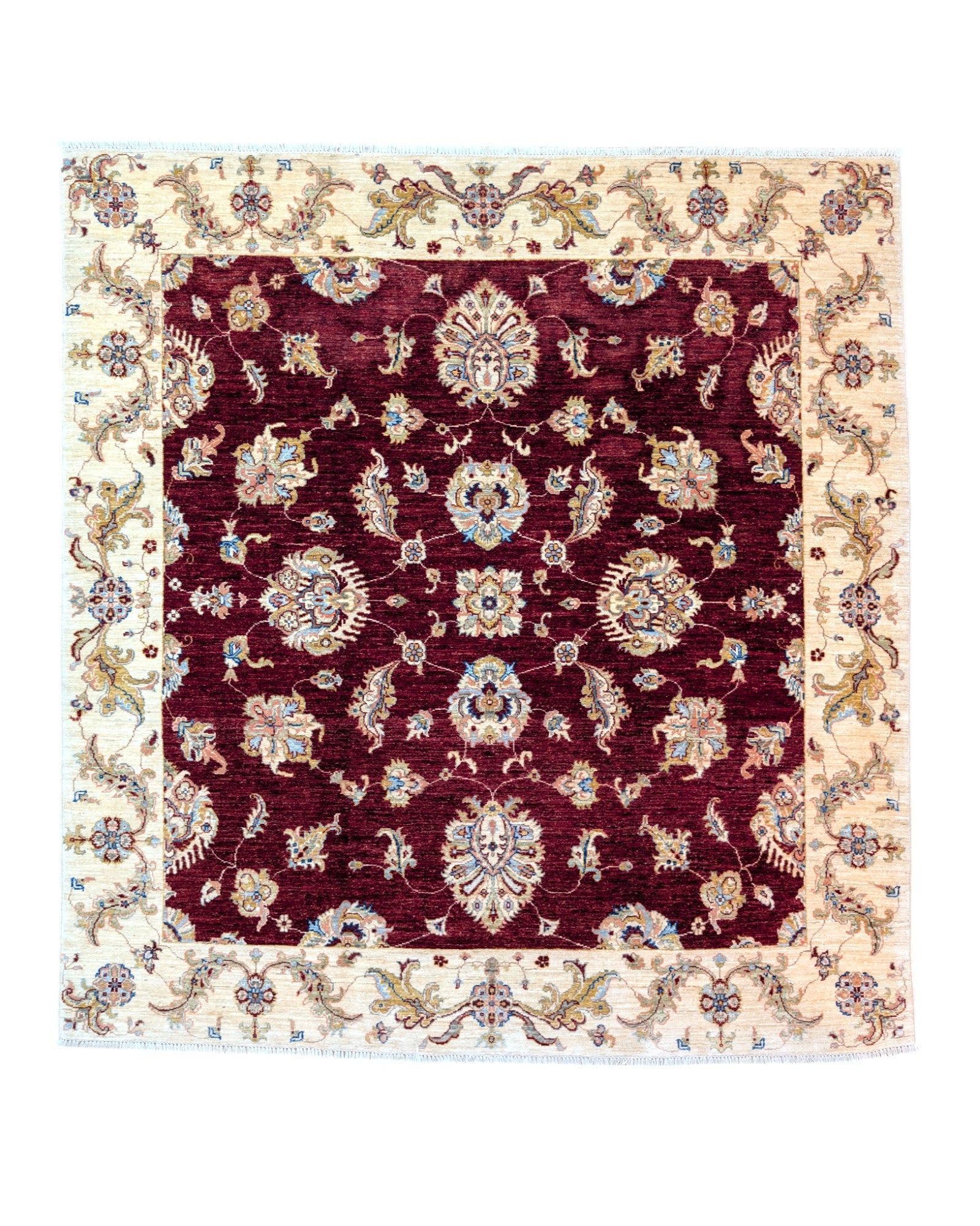 Aggiungi un tocco di eleganza classica e calore alla tua casa con questo splendido Tappeto Farahan Ziegler. Annodato a mano su telaio tradizionale in Afghanistan, questo tappeto di 211 x 200 cm è un vero capolavoro di artigianato. Il design presenta un ricco campo bordeaux, ornato da un motivo floreale stilizzato e simmetrico, tipico dei tappeti Ziegler. I colori vegetali, con sfumature di beige, blu e giallo, creano un'armonia cromatica raffinata e accogliente. La bordura, con il suo motivo floreale delicato, incornicia l'intero tappeto con eleganza. Realizzato con cotone resistente e un vello in pura lana, questo tappeto offre una morbidezza lussuosa e una durabilità eccezionale. L'annodatura a mano e i colori vegetali conferiscono al tappeto un fascino unico e autentico