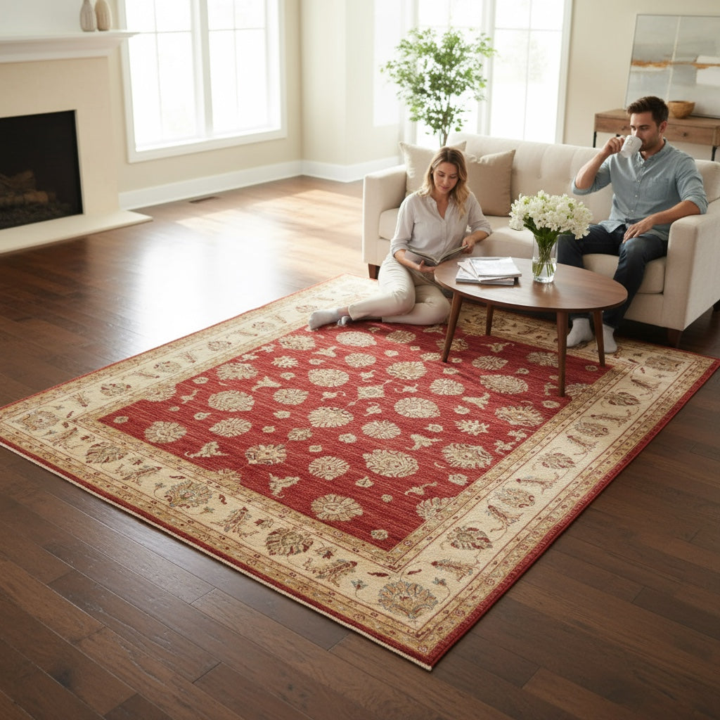 Design: Motivi floreali tradizionali su campo rosso intenso con bordura beige chiaro