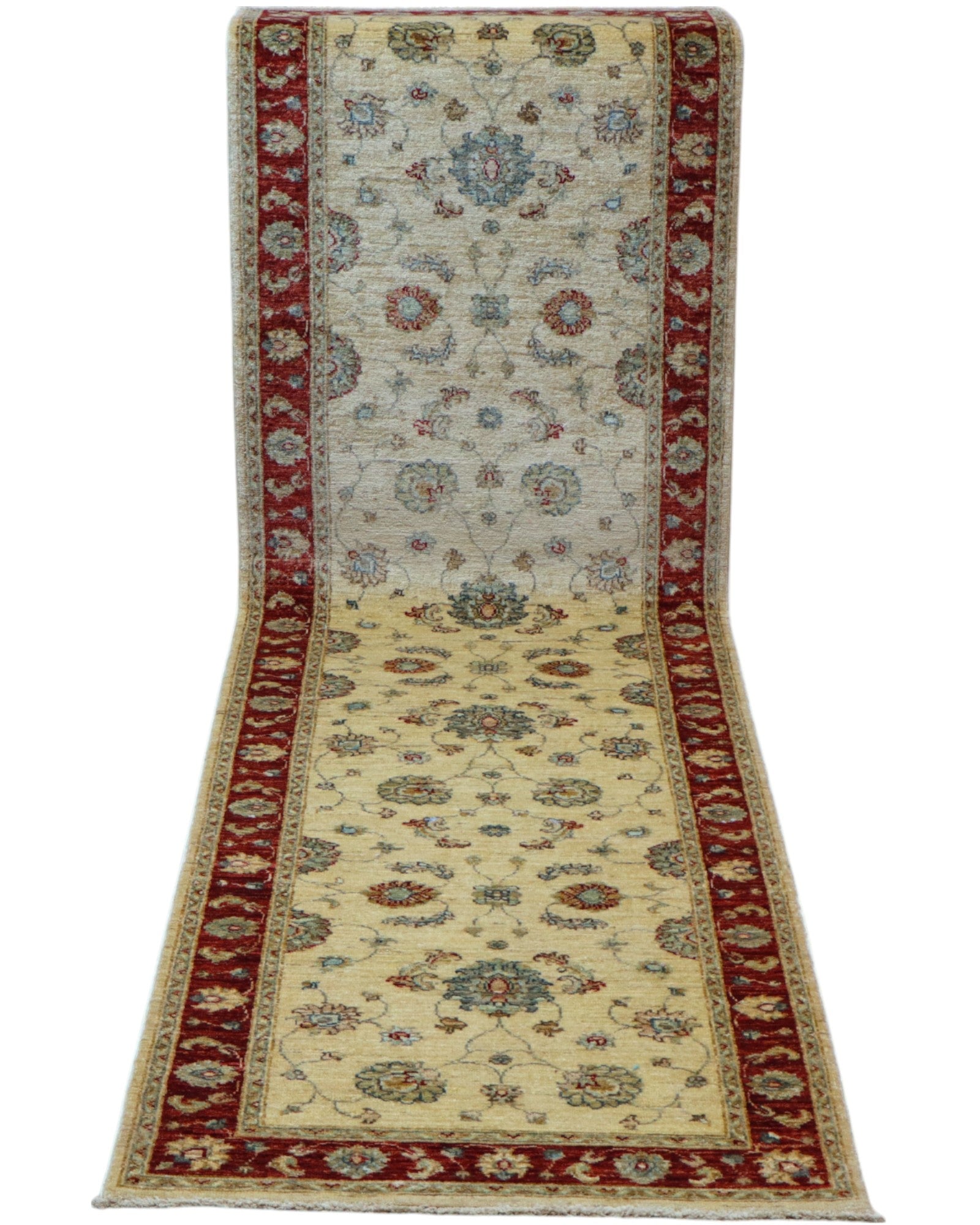 Questo tappeto Farahan Ziegler è un'autentica espressione di arte e maestria artigianale. Annodato a mano sul telaio tradizionale da esperti artigiani, con trama e ordito in cotone resistente e un vello in pura lana tinta con colori vegetali. Con le sue dimensioni di 290 x 82 cm, questo pezzo si rivela un esemplare di notevole bellezza e squisita fattura.
