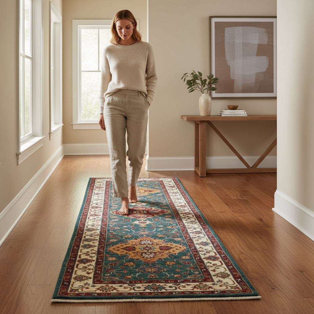 Questo tappeto Ziegler di alta qualità è un'autentica espressione di arte e maestria artigianale. Annodato a mano sul telaio tradizionale da esperti artigiani, con trama e ordito in cotone resistente e un vello in pura lana tinta con colori vegetali. Con le sue dimensioni di 291 x 81 cm, questo pezzo si rivela un esemplare di notevole bellezza e squisita fattura.