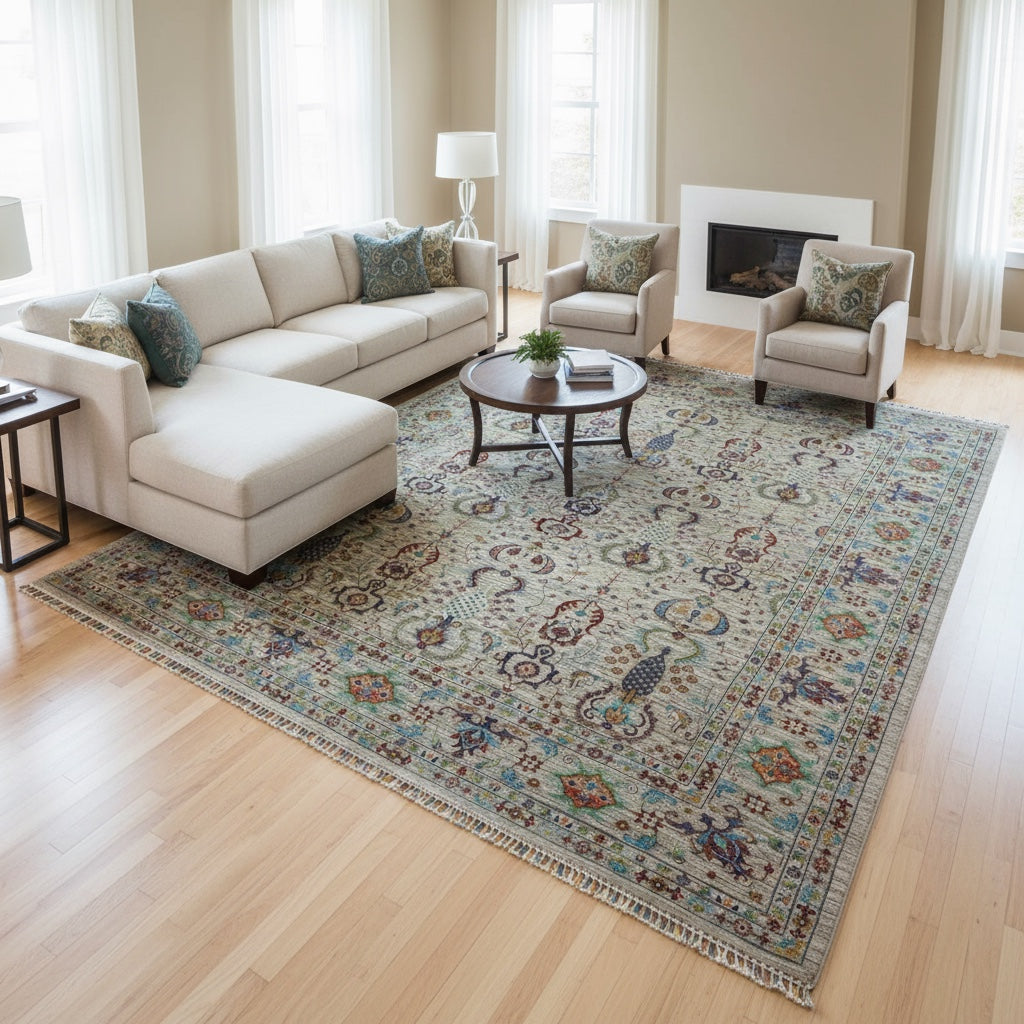 Il design presenta un campo color beige, adornato da motivi floreali e decorativi che si dispiegano con eleganza su tutta la superficie. Le sfumature armoniose dei fiori e degli elementi ornamentali creano un effetto visivo vibrante e affascinante, conferendo al tappeto un carattere lussuoso e una bellezza senza tempo. La cornice, anch'essa decorata con motivi floreali, completa con equilibrio e raffinatezza il disegno complessivo.