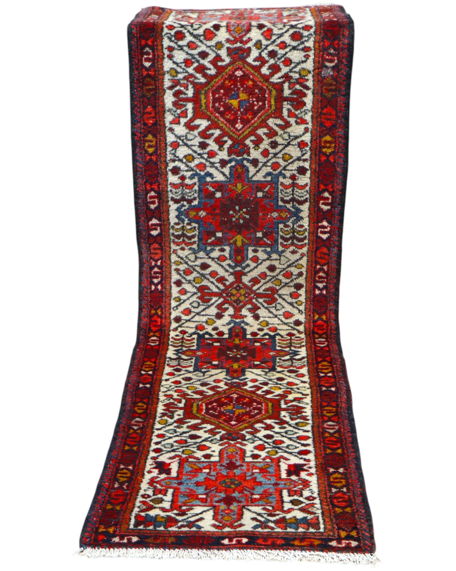Questo tappeto Gharage da 238 x 65 cm si distingue per il suo design geometrico audace e vivace. Il fondo chiaro in tonalità avorio è arricchito da una sequenza di motivi esagonali e romboidali in rosso intenso e blu, intervallati da dettagli gialli che aggiungono luminosità e movimento. La cornice decorativa multicolore incornicia con eleganza la composizione, creando un equilibrio visivo armonico. Ogni nodo testimonia la sapiente maestria degli artigiani, che hanno saputo trasformare lana e cotone in un pezzo unico capace di arricchire corridoi e spazi lunghi con un carattere deciso e autentico.