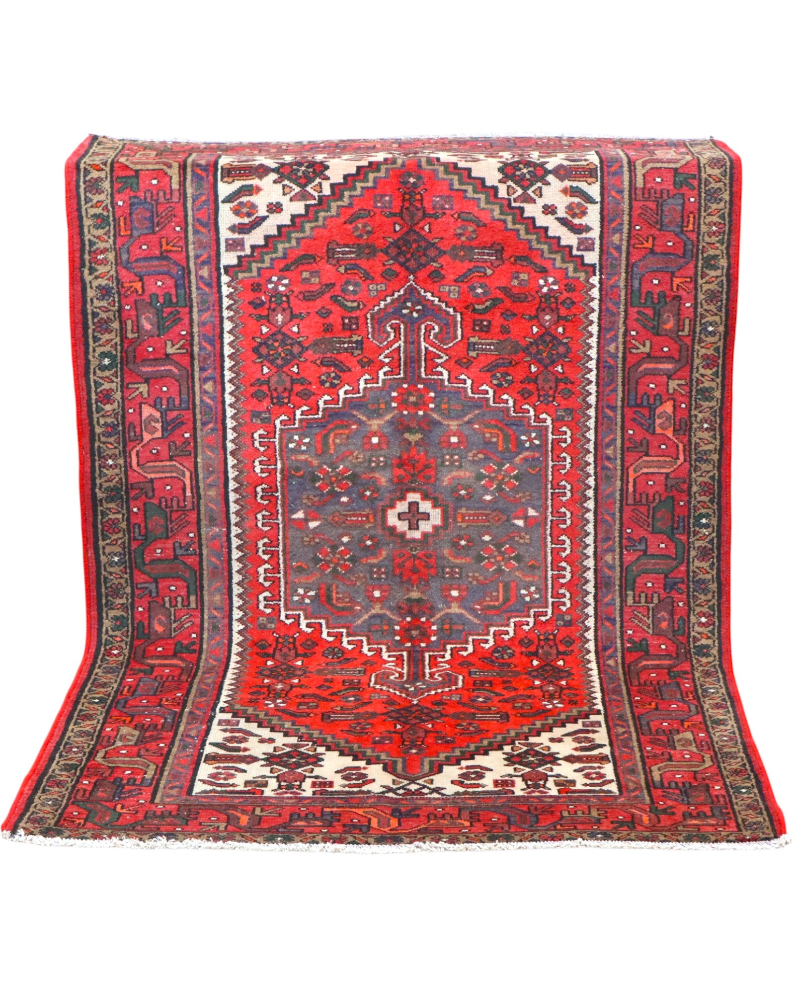 Il fondo rosso, arricchito da dettagli geometrici tipici della lavorazione Hamedan, trasmette forza ed equilibrio. La combinazione di tonalità e disegni rende questo tappeto un pezzo intramontabile, capace di valorizzare con fascino autentico ogni ambiente.
