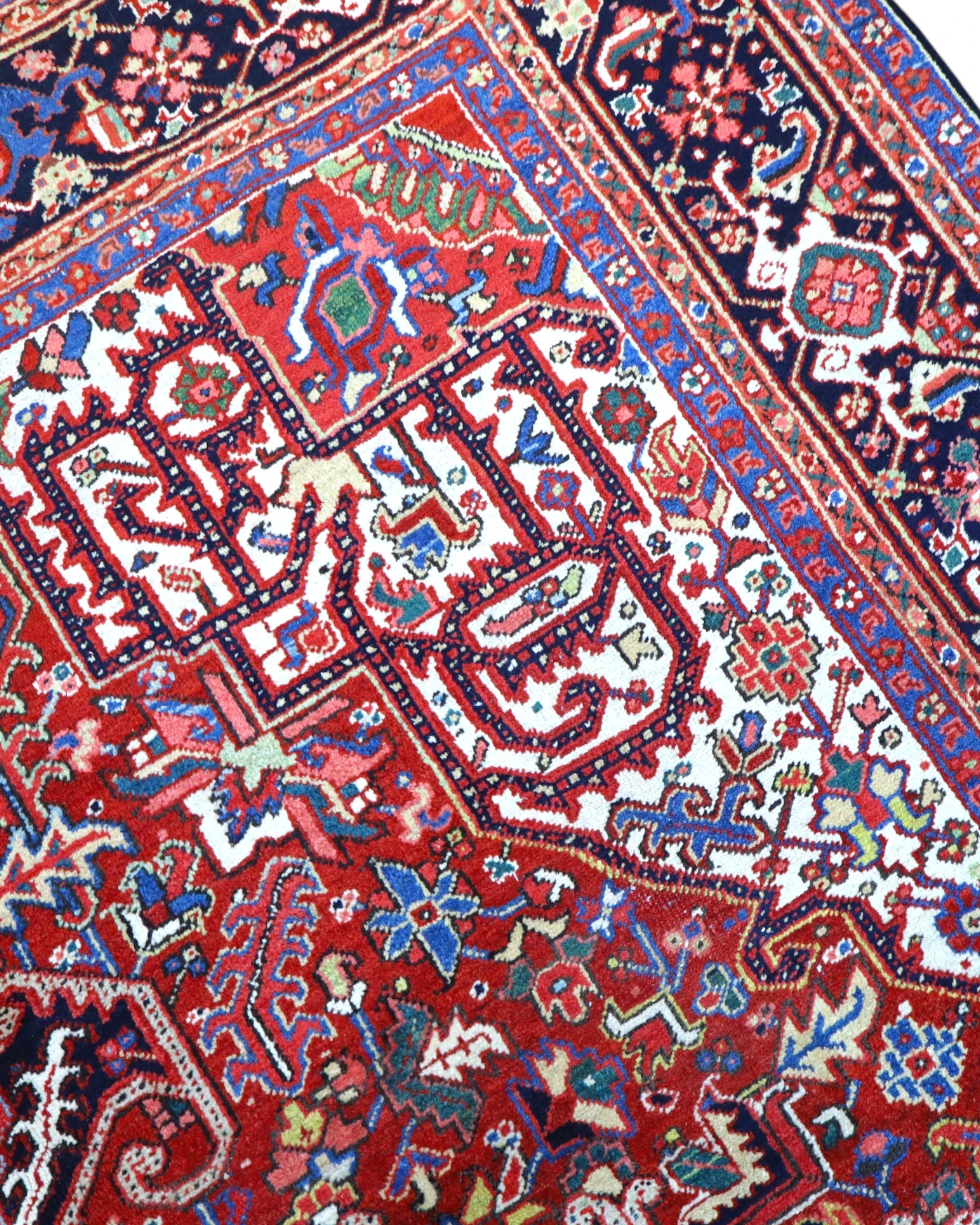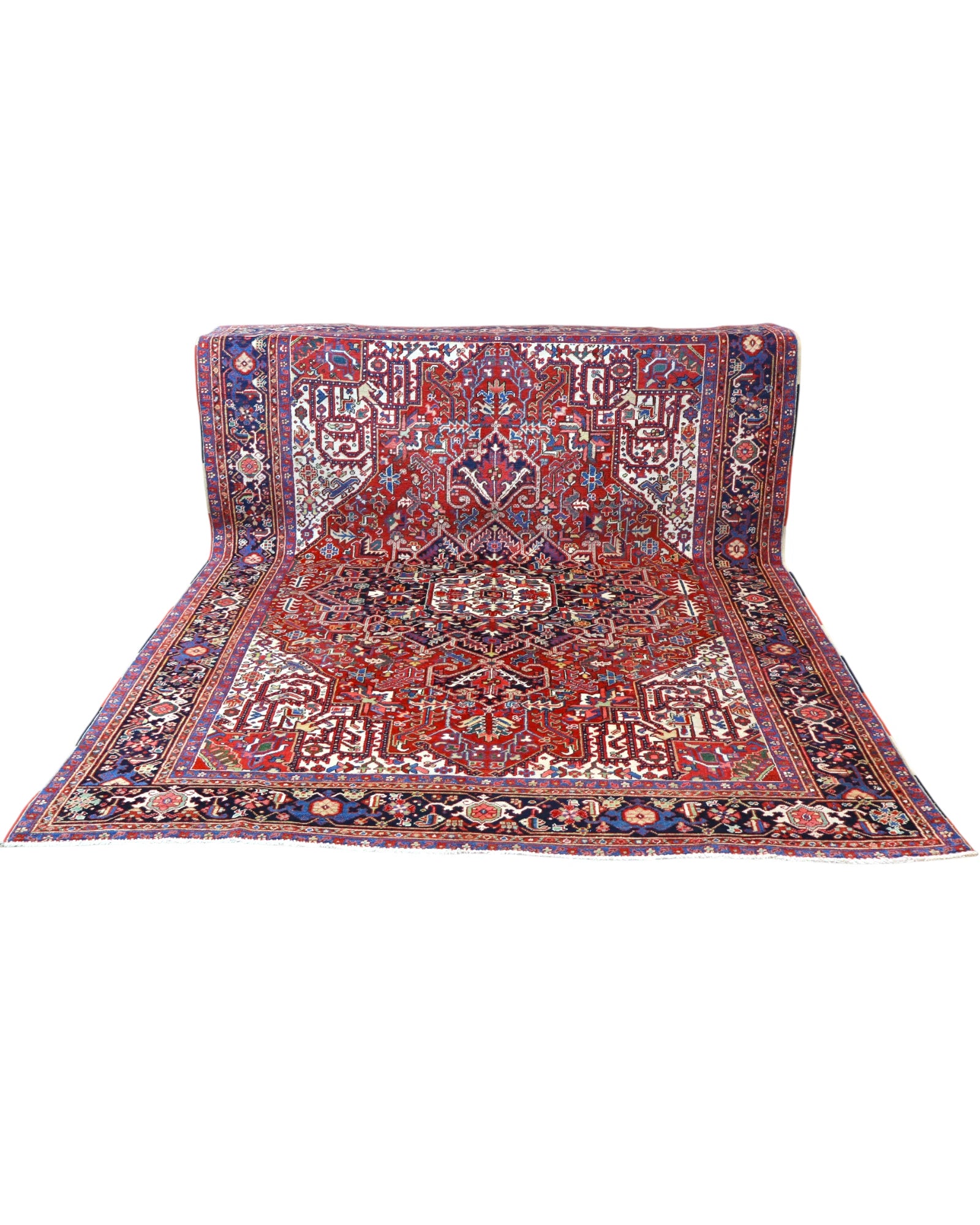 Questo tappeto Heriz è un magnifico esempio di robustezza ed eleganza, apprezzato per il suo disegno geometrico centrale e per la presenza di motivi floreali che arricchiscono con armonia l’intera superficie. È stato annodato a mano sul telaio tradizionale da esperti artigiani, realizzato con trama e ordito in cotone resistente e vello in lana tinta con colori vegetali. Le dimensioni di 336 x 248 cm lo rendono perfetto per grandi spazi, dove può valorizzare l’ambiente con la sua imponenza e il suo fascino intramontabile. La solidità della struttura e l’equilibrio estetico fanno di questo Heriz un pezzo unico, capace di unire bellezza decorativa e durabilità nel tempo.