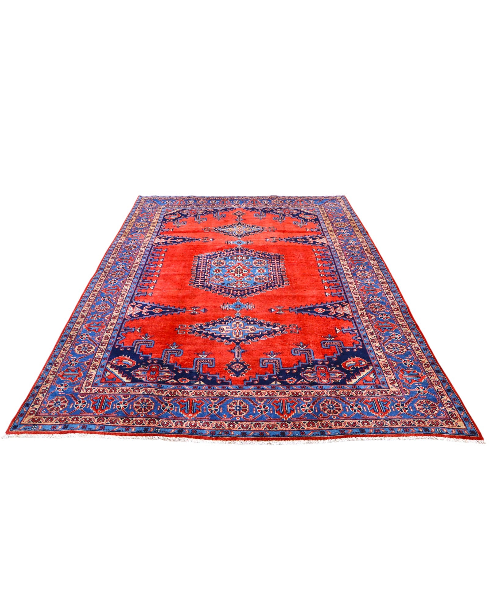 Questo tappeto golpaygan è un esempio straordinario di eleganza e robustezza, tipico della celebre manifattura persiana. È stato annodato a mano sul telaio tradizionale da esperti artigiani, realizzato con trama e ordito in cotone resistente e vello in lana tinta con colori vegetali. Le dimensioni di 339 x 219 cm lo rendono ideale come elemento centrale in spazi ampi, dove può esprimere tutta la sua forza estetica. Il fondo rosso, arricchito da motivi geometrici con dettagli blu, trasmette un equilibrio tra imponenza e raffinatezza. La qualità della lavorazione e la ricchezza dei materiali rendono questo Heriz un tappeto destinato a durare nel tempo, donando prestigio e carattere a qualsiasi ambiente.