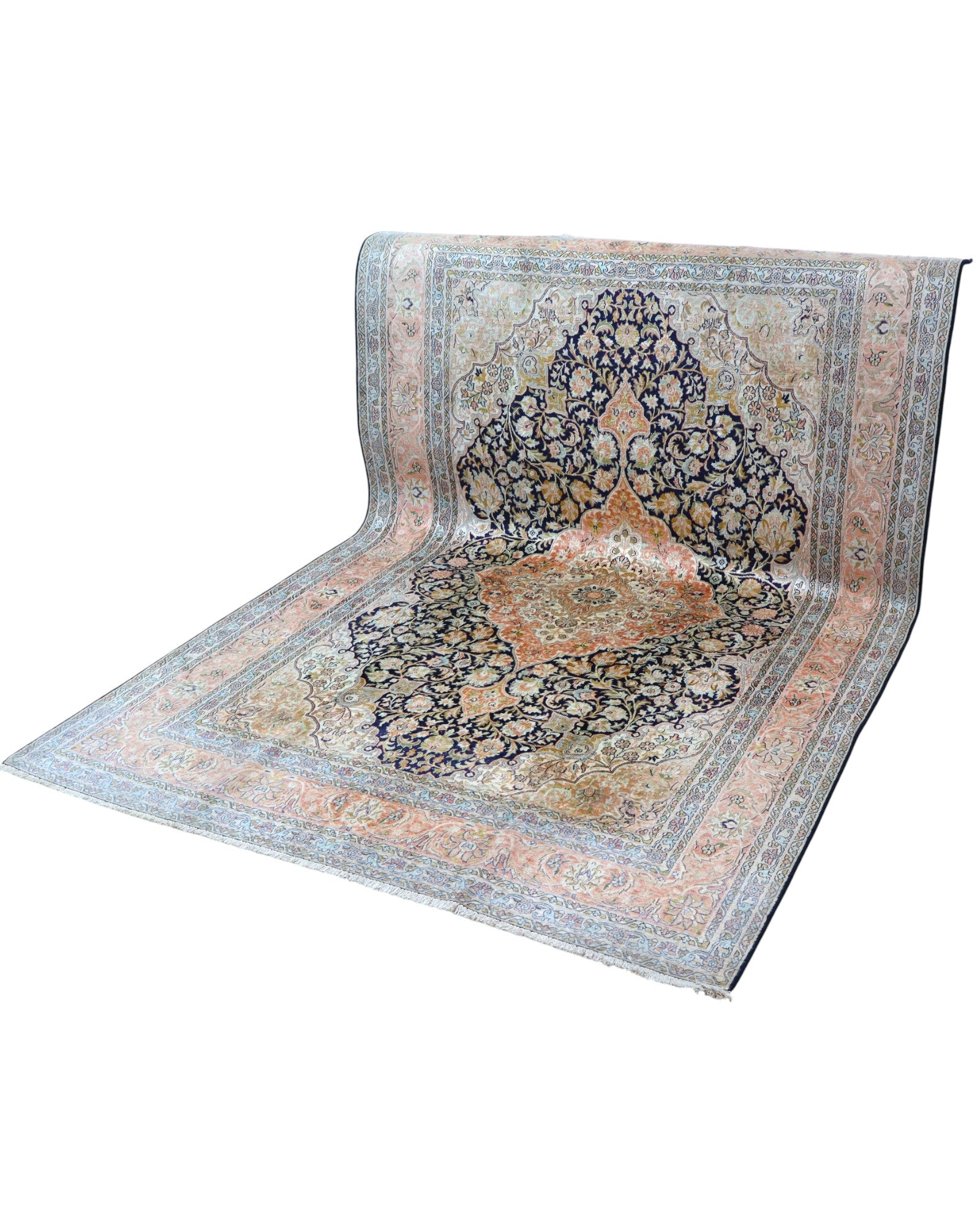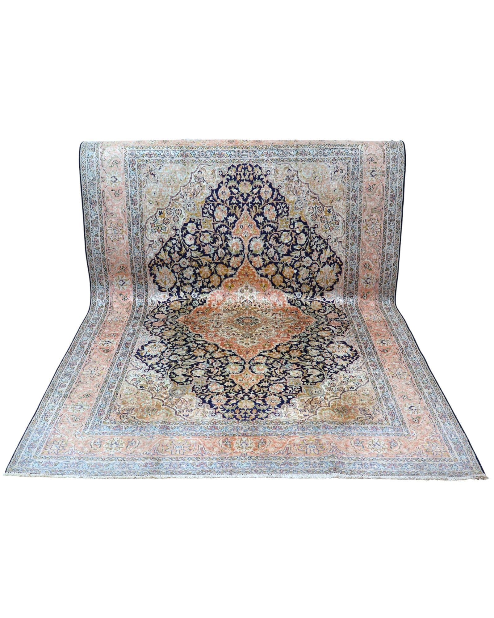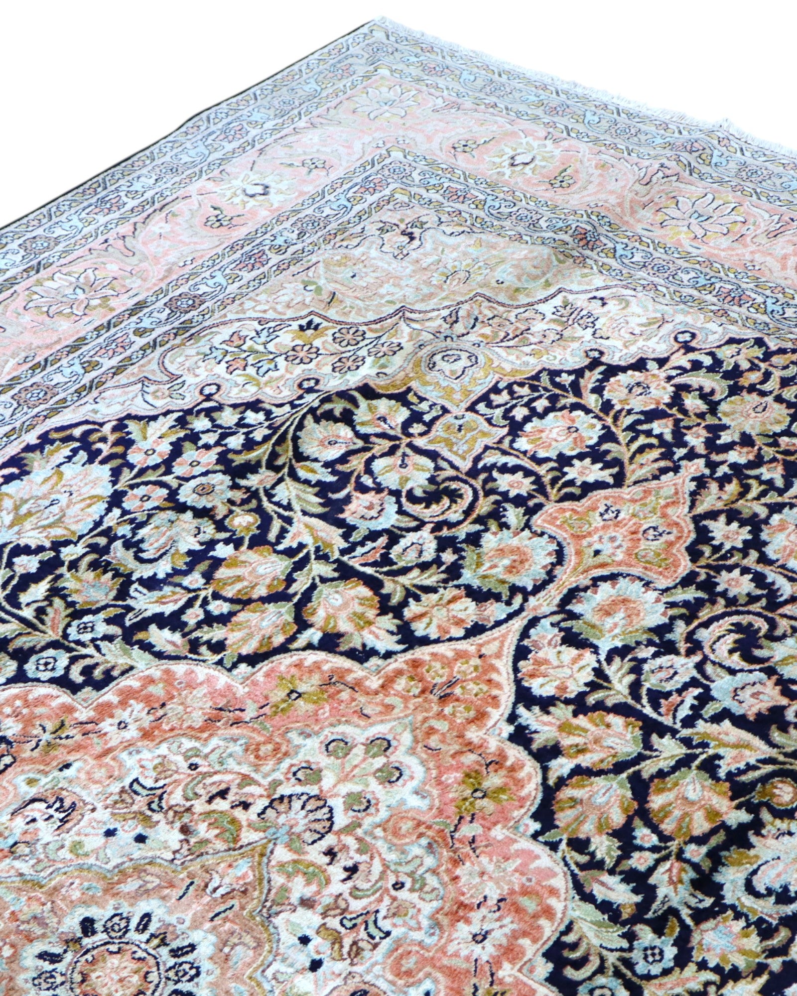 Questo elegante tappeto indiano unisce la raffinatezza estetica della tradizione persiana all’abilità artigianale dell’India, creando un pezzo decorativo armonioso e luminoso. Il medaglione centrale, in delicate tonalità pesca e avorio, si fonde con un campo blu notte riccamente ornato da motivi floreali stilizzati. L’uso della seta dona una brillantezza naturale, sottolineando dettagli come petali, foglie e tralci sinuosi.