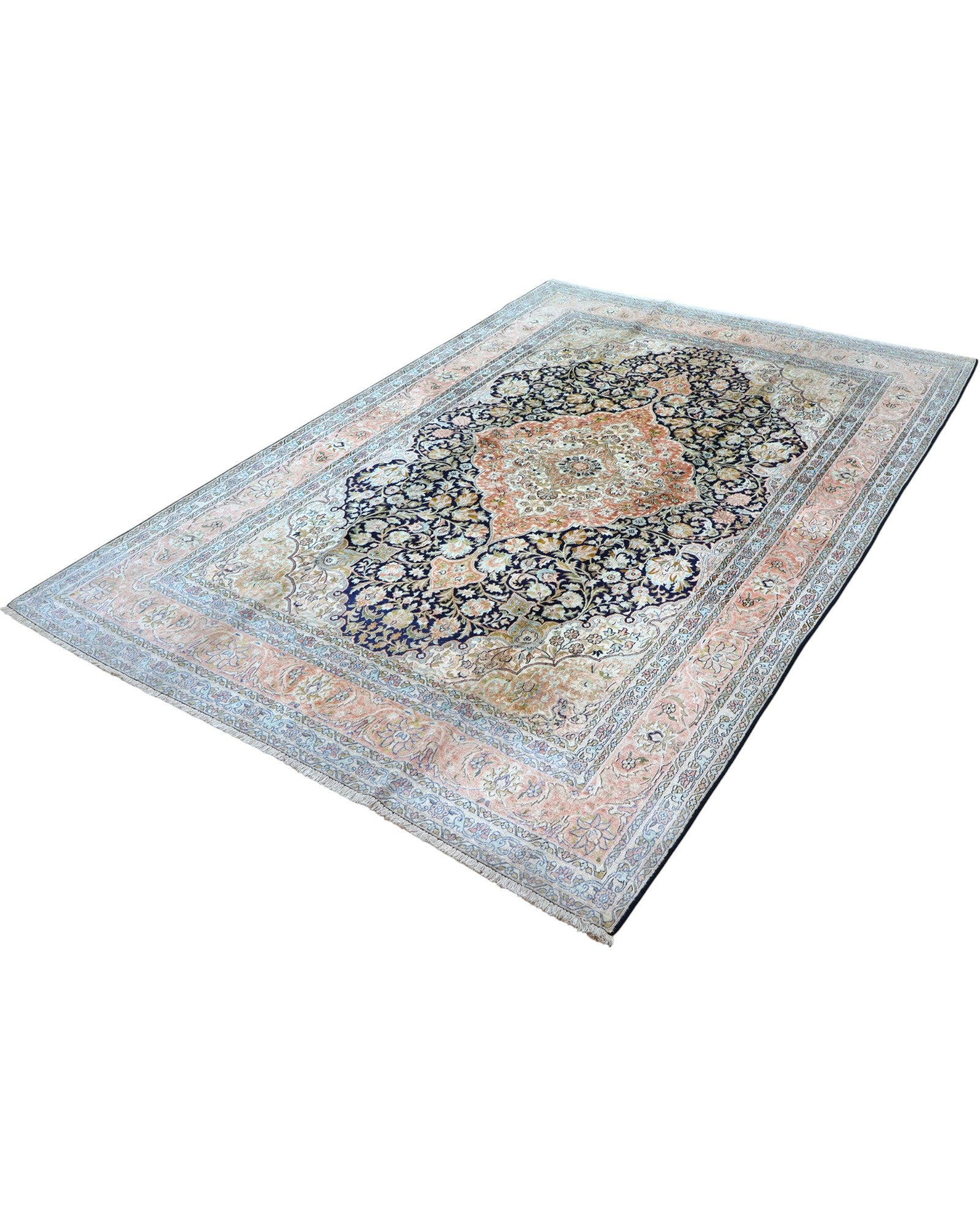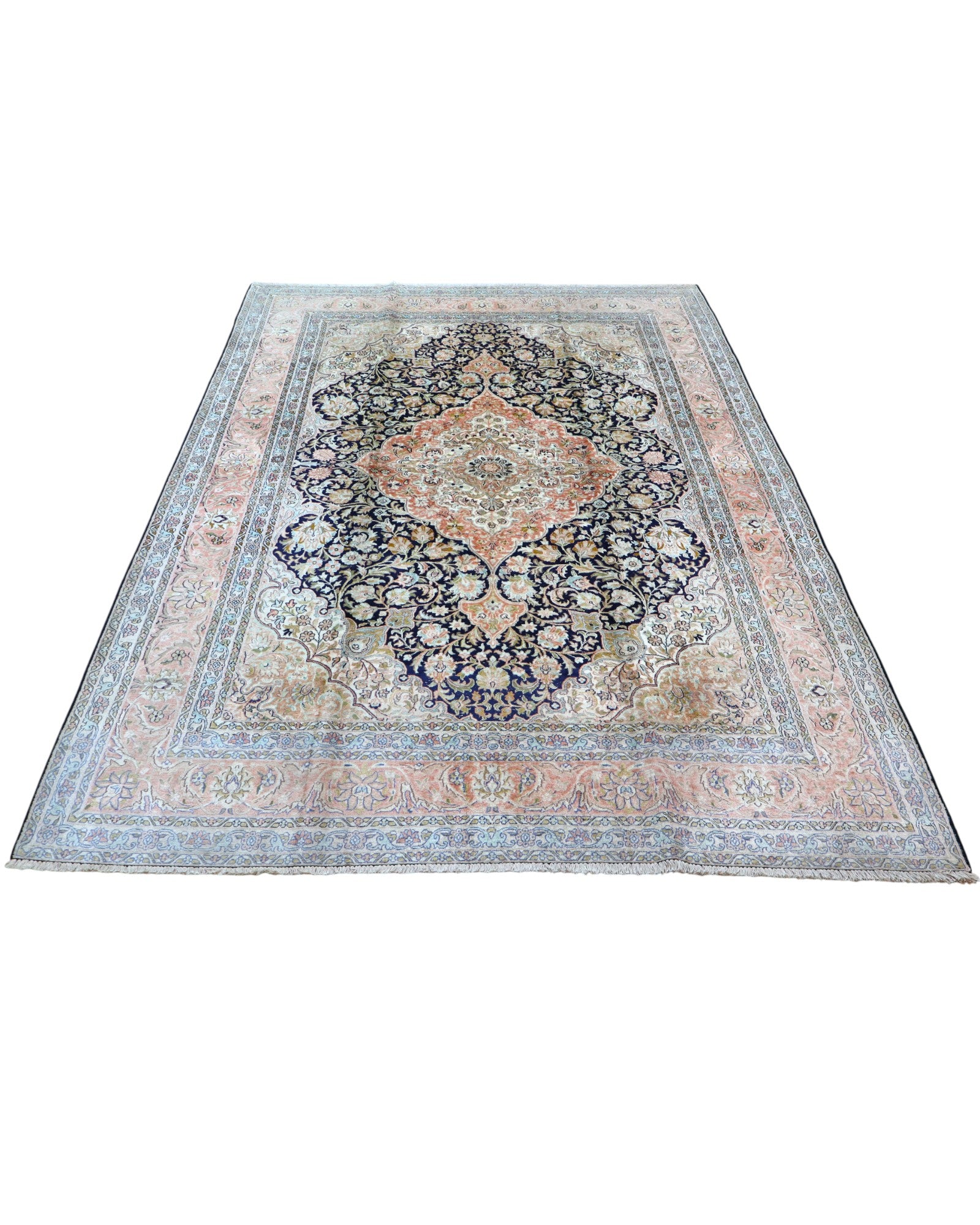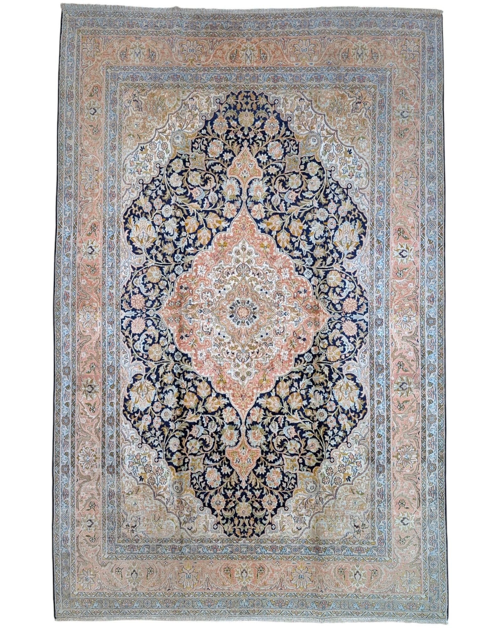 Questo elegante tappeto indiano unisce la raffinatezza estetica della tradizione persiana all’abilità artigianale dell’India, creando un pezzo decorativo armonioso e luminoso. Il medaglione centrale, in delicate tonalità pesca e avorio, si fonde con un campo blu notte riccamente ornato da motivi floreali stilizzati. L’uso della seta dona una brillantezza naturale, sottolineando dettagli come petali, foglie e tralci sinuosi.