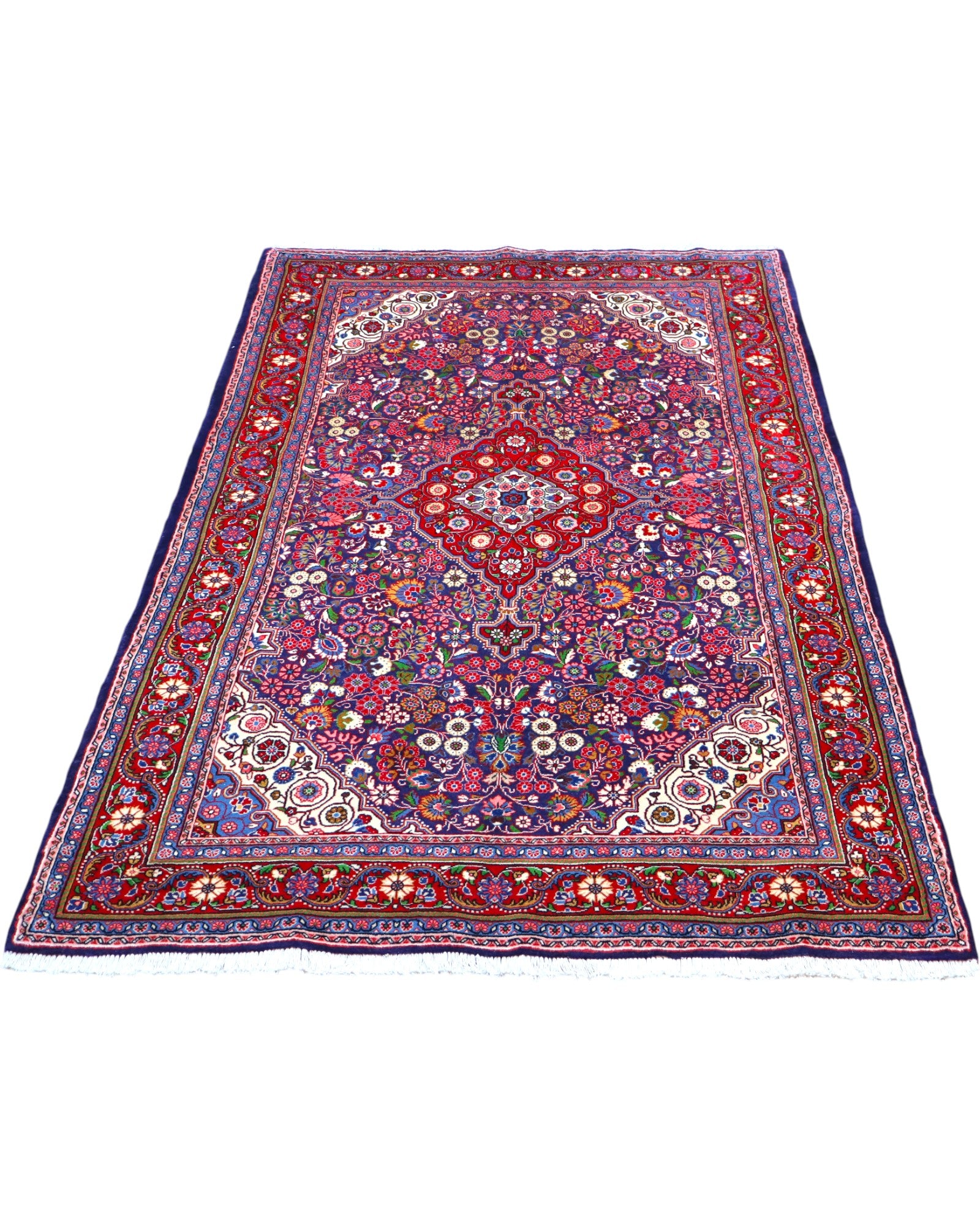 Questo tappeto bijar 203x131 cm colpisce per la sua ricchezza cromatica e il disegno floreale elaborato. Il campo è dominato da un medaglione centrale rosso, incorniciato da una fitta decorazione floreale che si espande su tutto il tappeto, con un’infinità di dettagli in blu, rosa, verde e avorio.