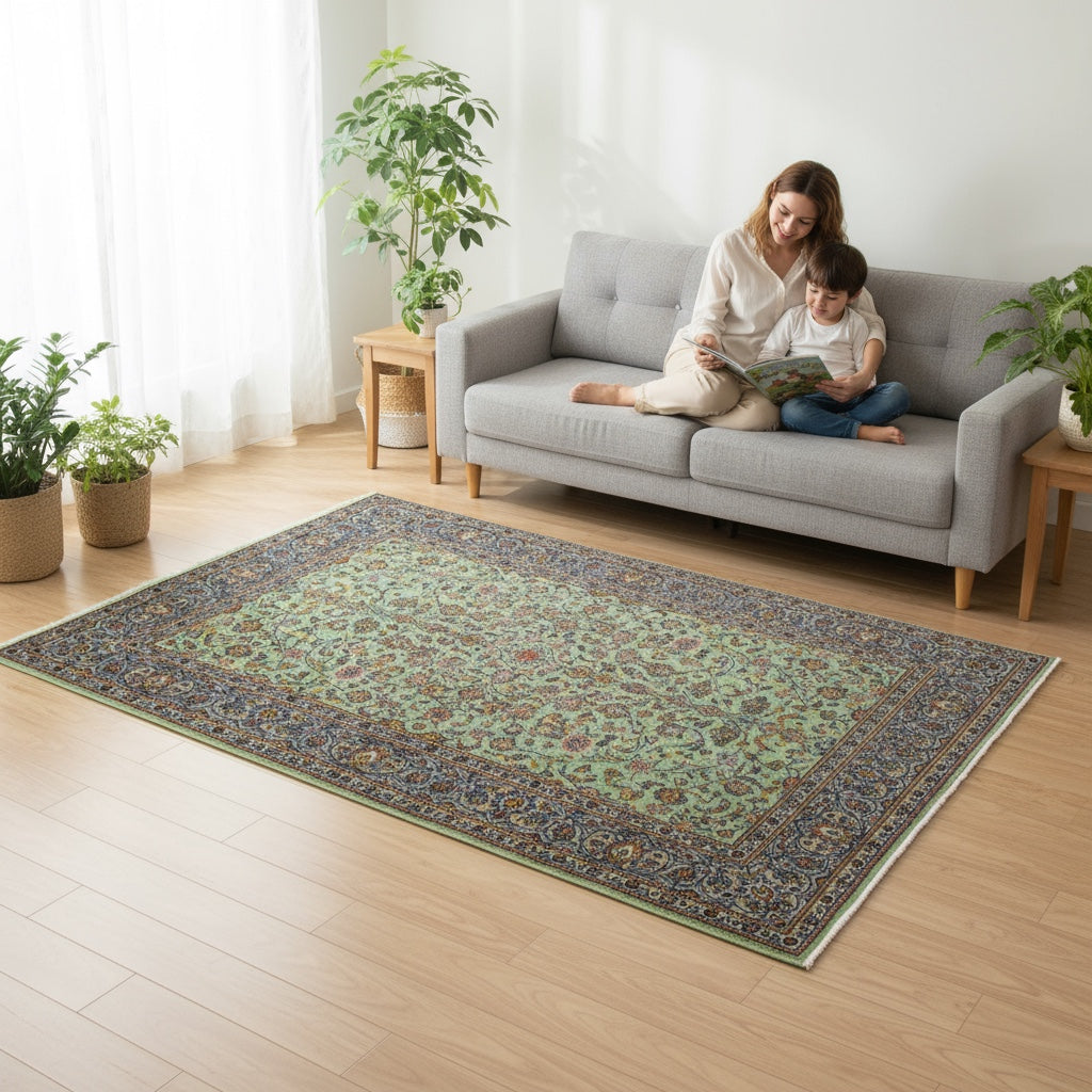 Il design si distingue per un fondo nel delicato colore verde, arricchito da motivi decorativi che si snodano con armonia su tutta la superficie. La combinazione di tonalità e la ricchezza dei dettagli conferiscono al tappeto un'eleganza intrinseca e una magnificenza che non passa inosservata.