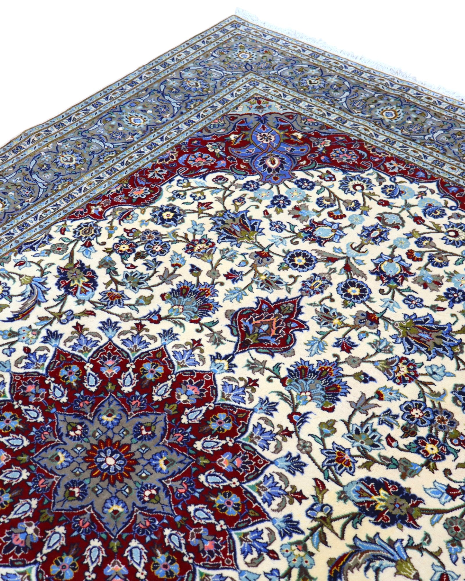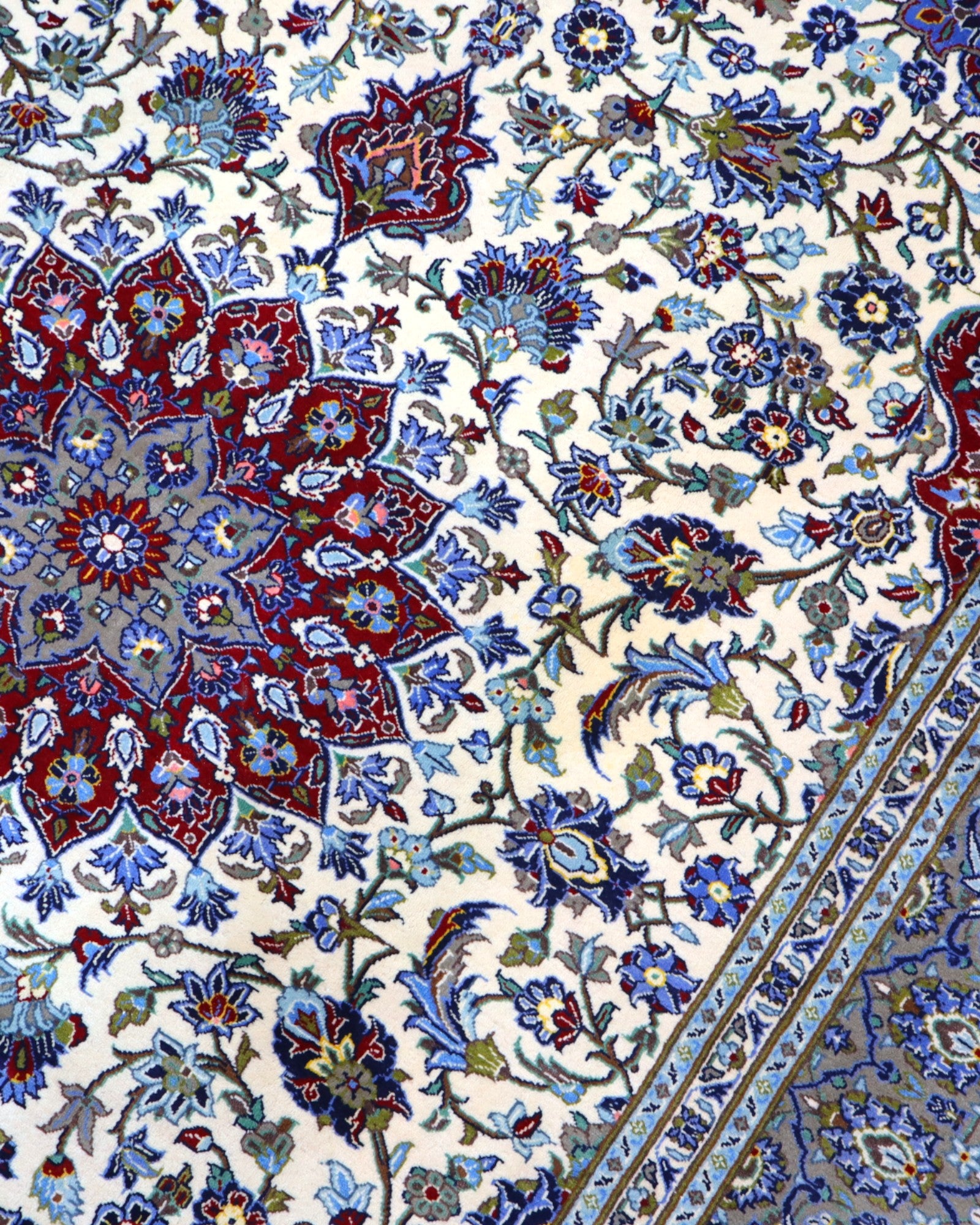 Questo raffinato tappeto Kashan incarna la tradizione persiana più classica, con un disegno ricco e armonioso che si sviluppa attorno a un elaborato medaglione centrale. Il fondo avorio esalta la complessità dei motivi floreali e arabescati, mentre le tonalità rosso rubino e blu creano un contrasto elegante e luminoso.