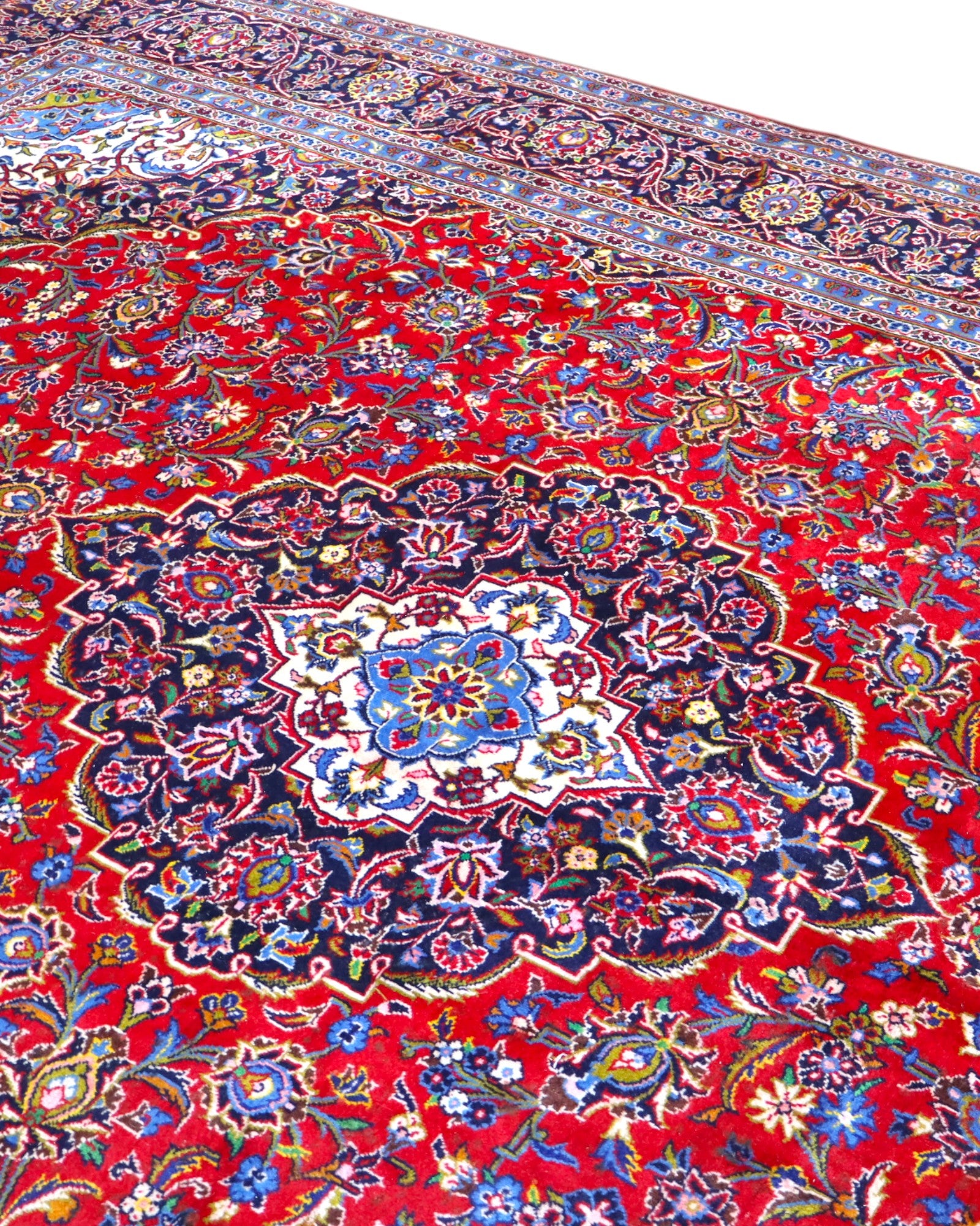 Questo tappeto Kashan è tramato ed annodato a mano su telai tradizionali da esperti artigiani, con trama e ordito in cotone resistente e vello in pura lana tinta con colori vegetali. Con le sue imponenti dimensioni di 402 x 297 cm, rappresenta un capolavoro di grande fascino e raffinatezza.