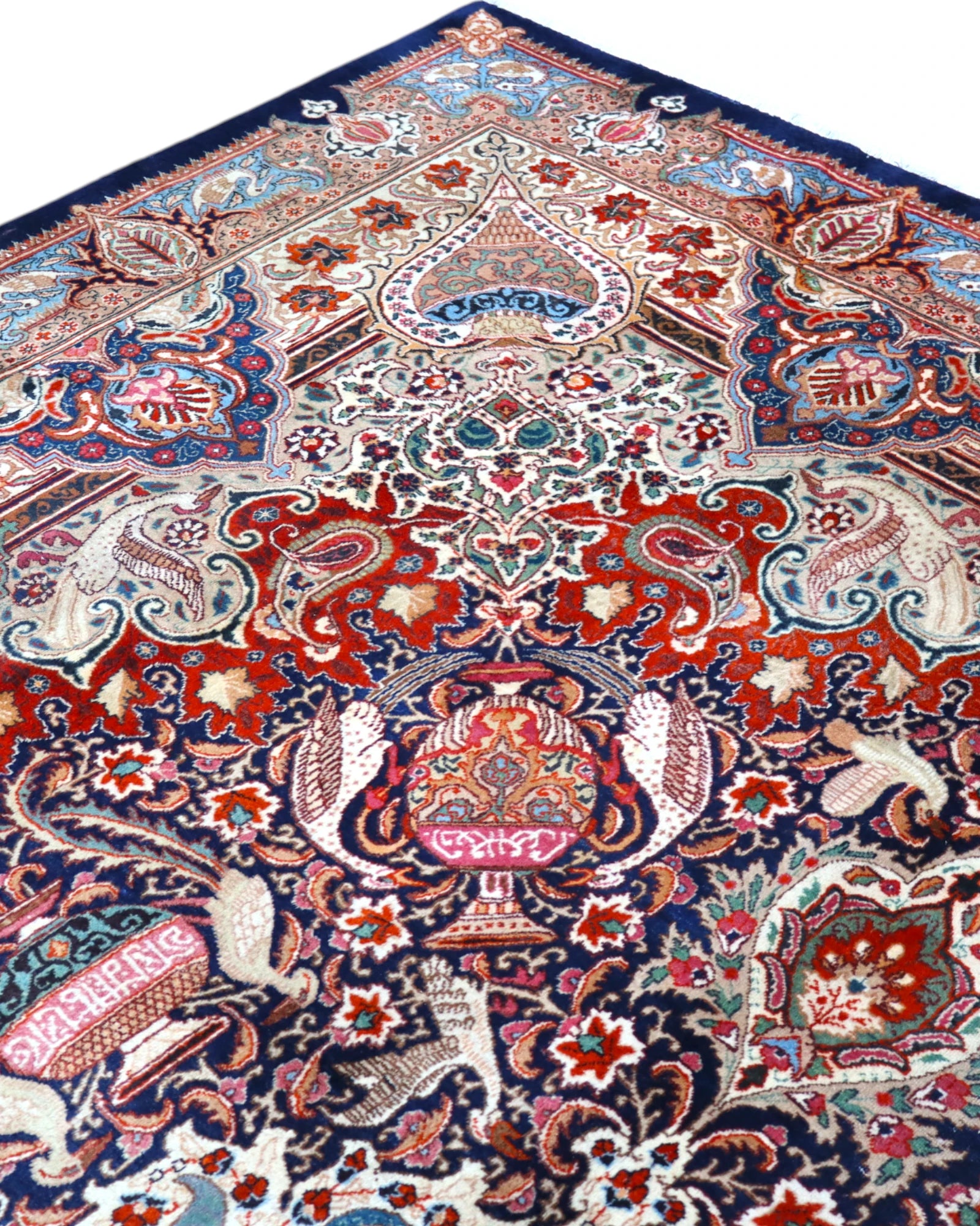 Un sontuoso tappeto Kashmar di grandi dimensioni, annodato a mano con maestria e raffinatezza. Il campo centrale, dominato da un elegante medaglione a fondo azzurro, è arricchito da dettagli floreali intricati che si intrecciano armoniosamente con motivi arabescati rossi e blu.